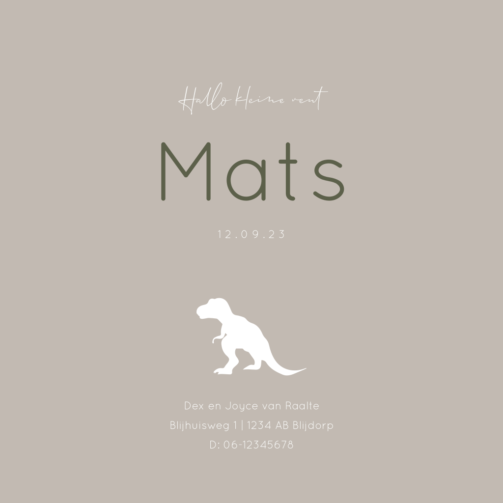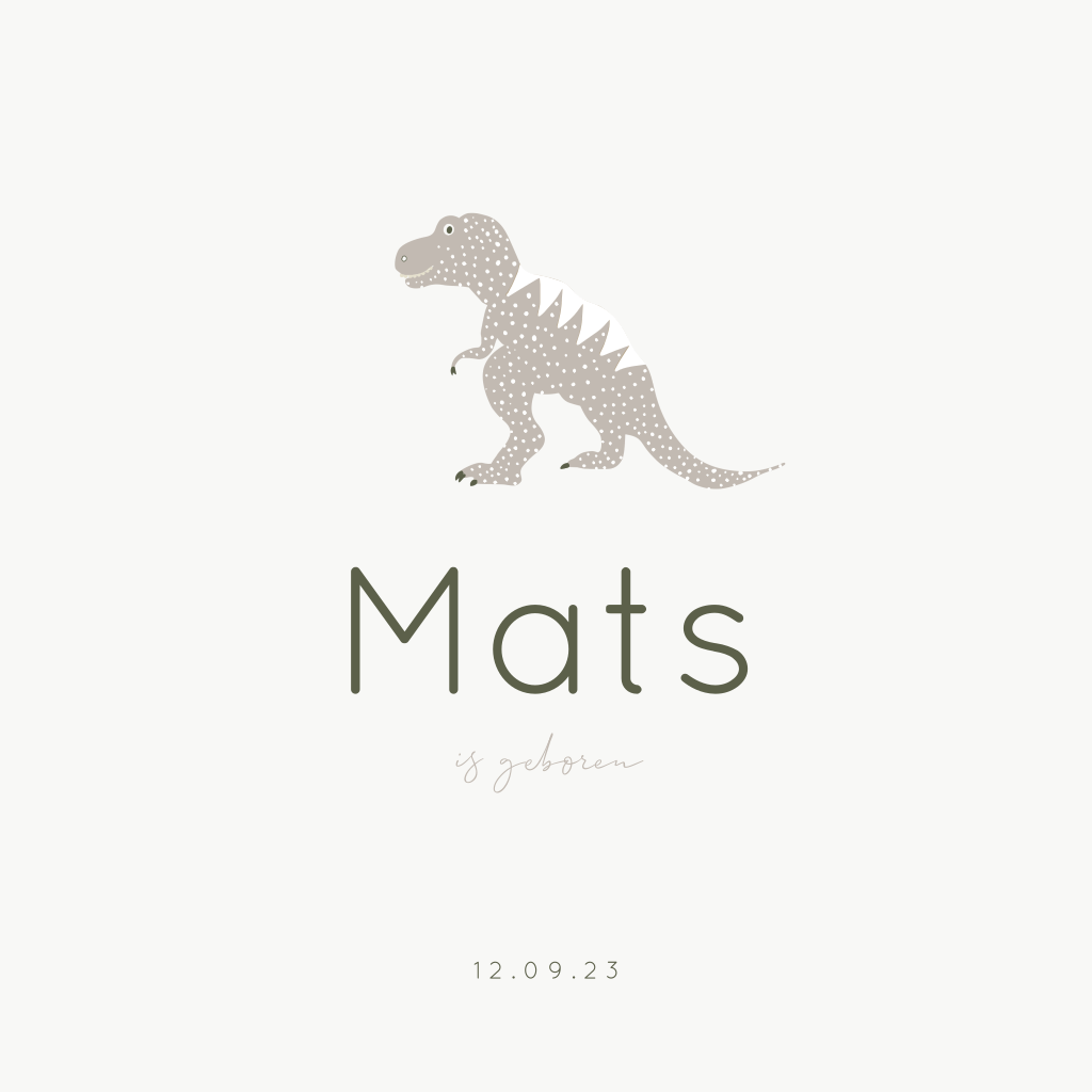 Dit geboortekaartje Mats is een ontwerp van Jollein® uit de Dino collectie en is speciaal in samenwerking met Jollein® ontworpen. Alle designelementen staan daarom vast waardoor het ontwerp zelf niet aanpasbaar is. Je kunt de teksten uiteraard wel gemakkelijk aanpassen in de editor. Hulp nodig? Laat het ons gerust weten!
