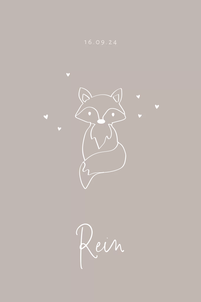 Geboortekaartje voor een jongen met een lief vosje met hartjes. Extra bijzonder aan dit geboortekaartje Rein is de dubbelzijdige goudfolie. Pas de teksten, lettertypes en kleuren eenvoudig aan in de editor.