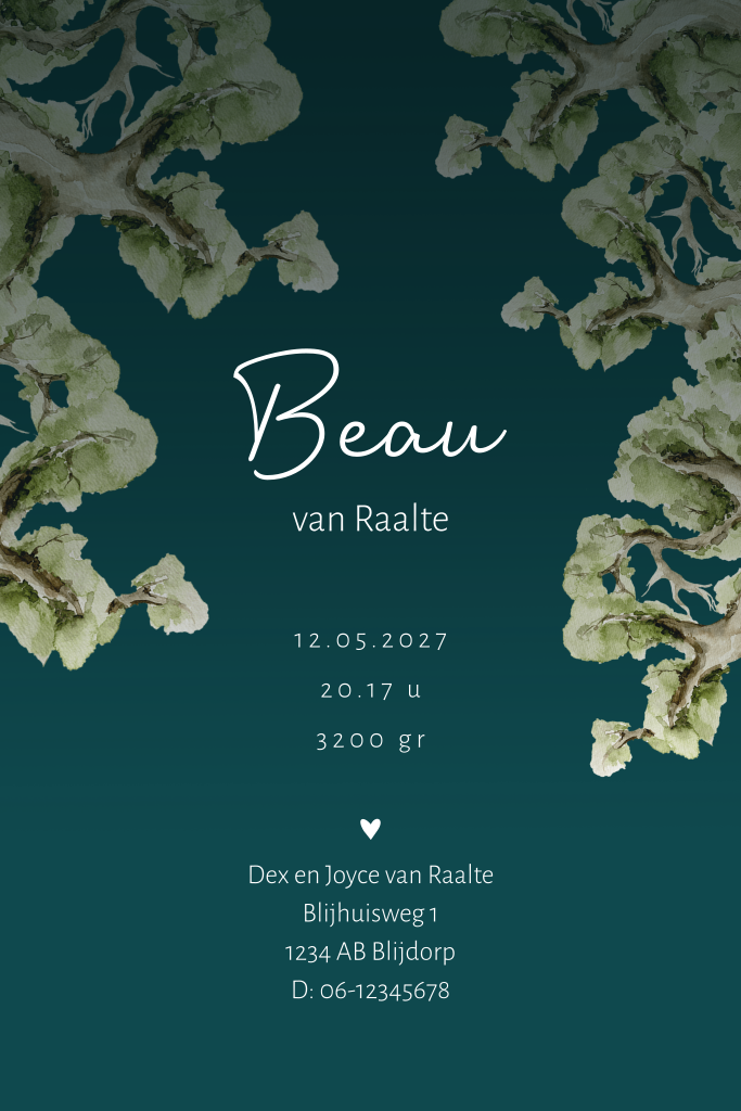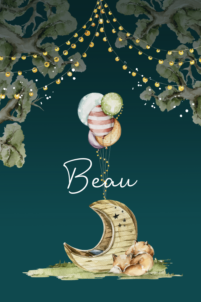 Welkom bij de geboortekaartjes van Blijkaartje! Op onze website vind je de leukste geboortekaartjes voor jongens en meisjes. Onze kaartjes zijn uniek en origineel, en perfect voor elke klein avonturier. Op dit prachtige bos geboortekaartje Beau zie je een sprookjesachtig tafereeltje in de nacht met rijk geïllustreerde bomen, lampenslinger en ballonnen. Op de voorgrond een maantje met twee slapende vosjes. Dit geboortekaartje voor een jongen is daarom ook zeker geschikt voor een tweede kindje. De gouden foliedruk geeft een extra speciale touch aan dit magische geboortekaartje. Liever andere teksten en lettertypes? Dit pas je eenvoudig aan in de editor.