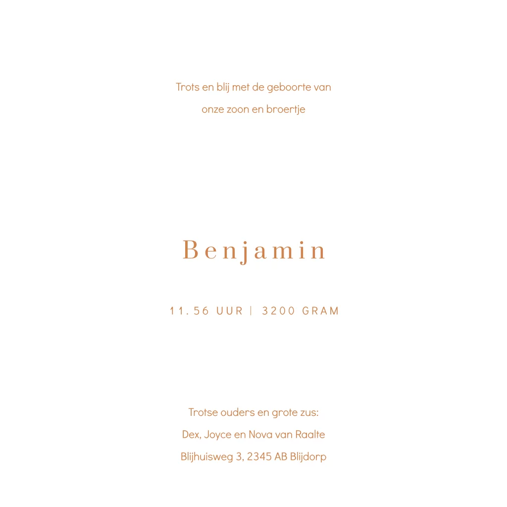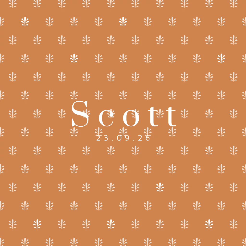 Exclusief geboortekaartje voor een jongen. Dit mooie geboortekaartje Scott heeft op de koperkleurige achtergrond een art deco patroon in wit en gouden foliedruk. Ook de naam en de geboortedatum wordt gedrukt in echt goufolie. Teksten en kleuren zijn aan te passen in onze editor. De kleur van de folie kun je makkelijk wijzigen naar bijvoorbeeld roséfolie of koperfolie.