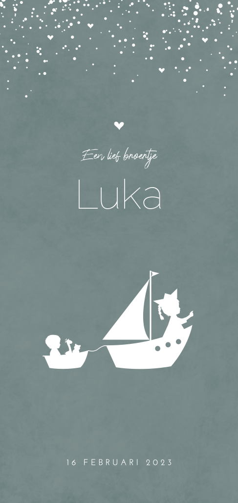 Geboortekaartje voor een tweede kindje, een jongen. Op dit kaartje Luka staat een silhouet van een grote zus en een klein broertje, samen op een bootje. Het silhouet en de kleine hartjes worden gedrukt in echt goudfolie. De groene velvet velours achtergrond geeft een warme uitstraling. Pas dit babykaartje naar je eigen smaak aan in de editor. De kleur van de folie kun je wijzigen naar zwartfolie, zilverfolie of koperfolie.