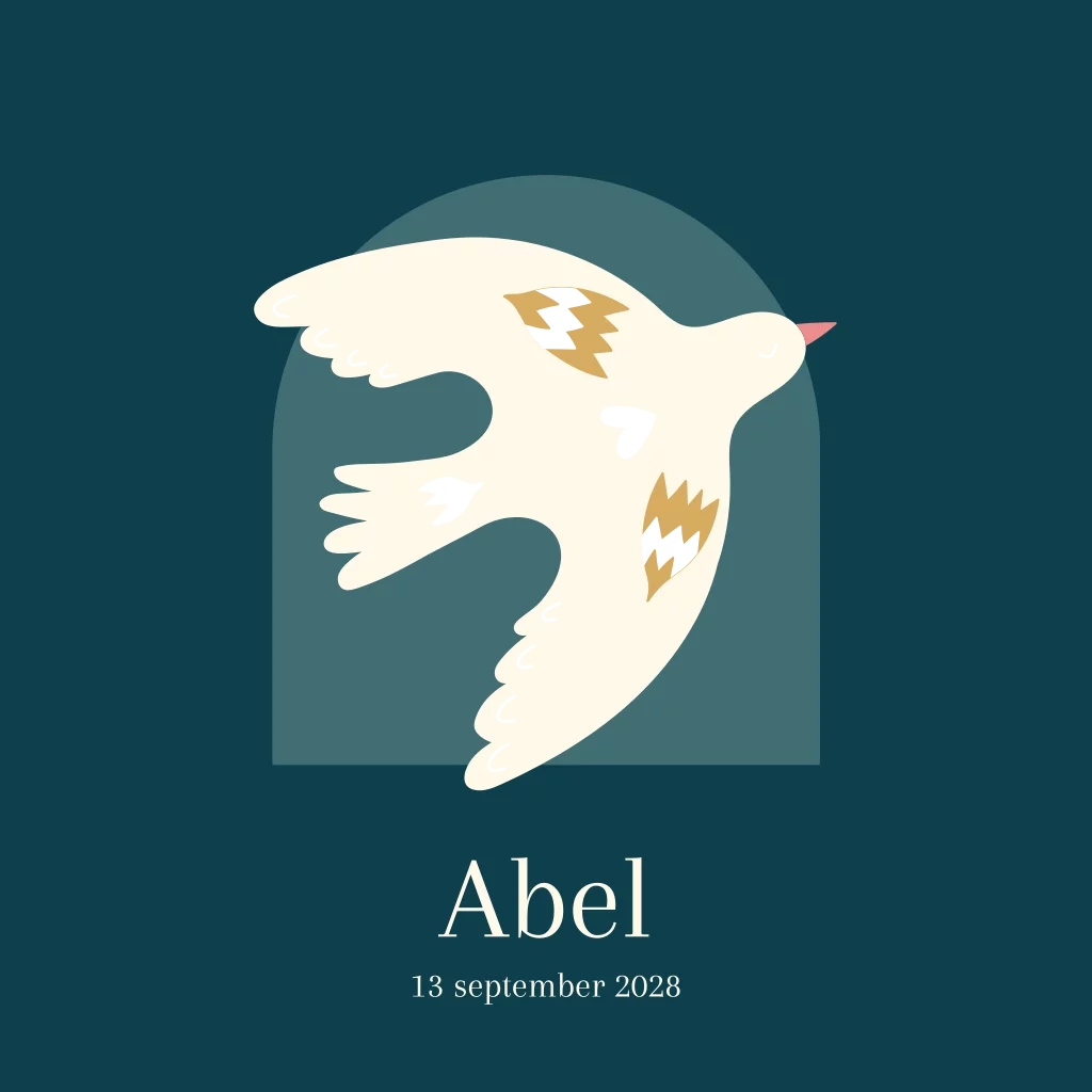 Op zoek naar een prachtig jongens geboortekaartje met een christelijk thema? Ontdek ons geboortekaartje Abel met een sierlijke vredesduif en foliedruk. Kleine deeltjes op de vleugel van de duif is in roséfolie vormgegeven. Dit geeft het kaartje een luxe uitstraling. De vredesduif symboliseert vrede en liefde. Pas het geboortekaartje voor jullie zoon naar eigen wens aan in de online editor.