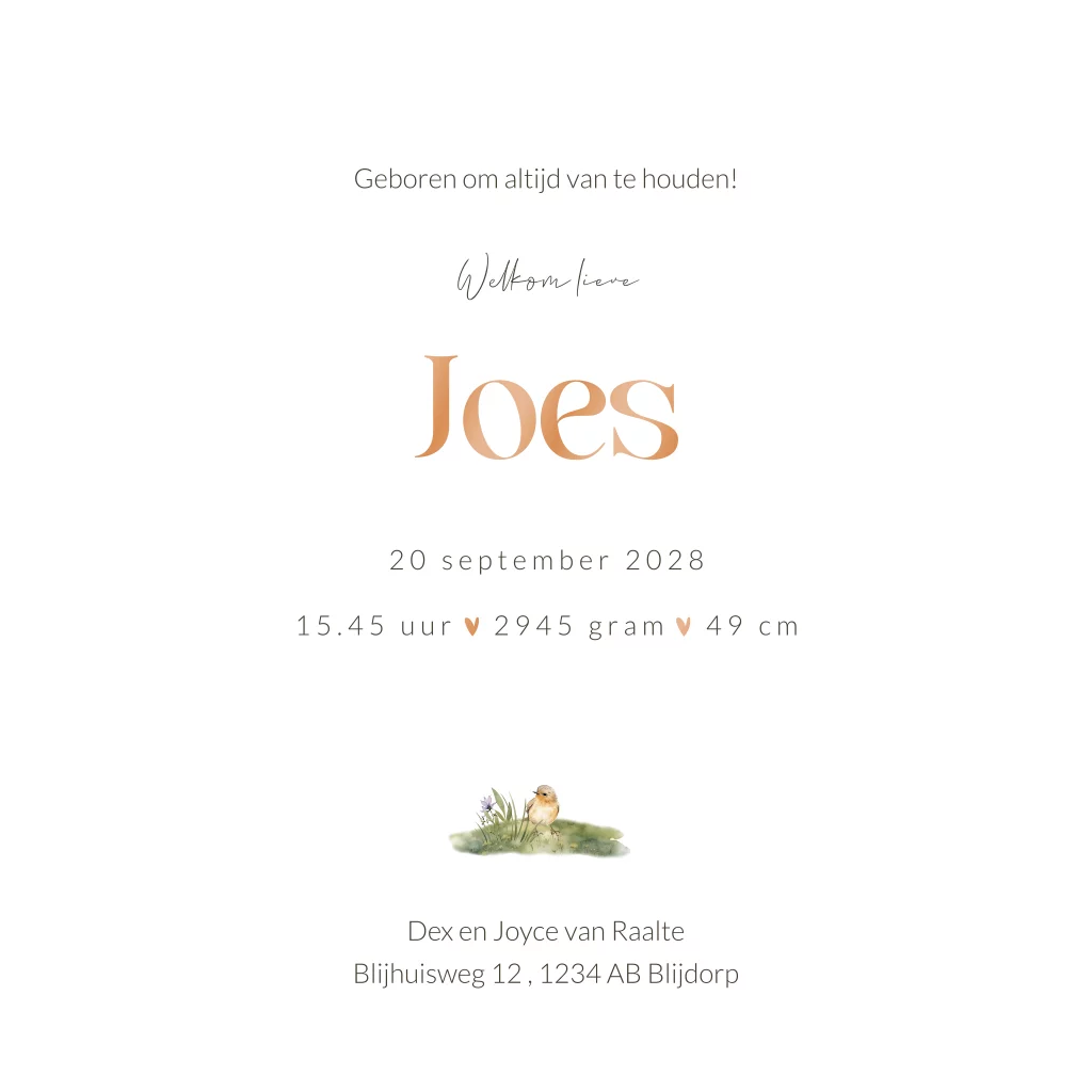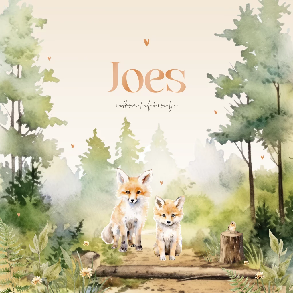 Uniek rijk geïllustreerd bosdieren geboortekaartje voor een jongen. Op dit geboortekaartje Joes zie je een aquarel schildering van een bos met twee vosjes. Dit kaartje is voor een eerste kindje maar kan ook zeker voor een tweede kindje gebruikt worden, de vosjes zijn dan broer of zus. De hartjes en naam van jullie zoon worden gedrukt in hoogglans. Hoogglans geboortekaartjes zijn een echte eyecatcher en staan garant voor een unieke uitstraling. Pas dit geboortekaartje naar je eigen smaak aan in de editor en combineer met een mooie envelop en sluitzegel om het helemaal af te maken.