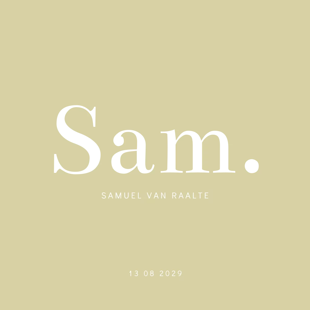 Stoer geboortekaartje met afgeronde hoeken en foliedruk. Dit jongenskaartje Sam heeft een neutraal basic ontwerp. Hierdoor, en door het gebruik van holografisch folie, springt de naam van jullie jonge zoon er extra uit. Pas de teksten, kleuren en lettertypes naar je eigen smaak aan in de editor. Hulp nodig? Mail, bel of chat gerust!