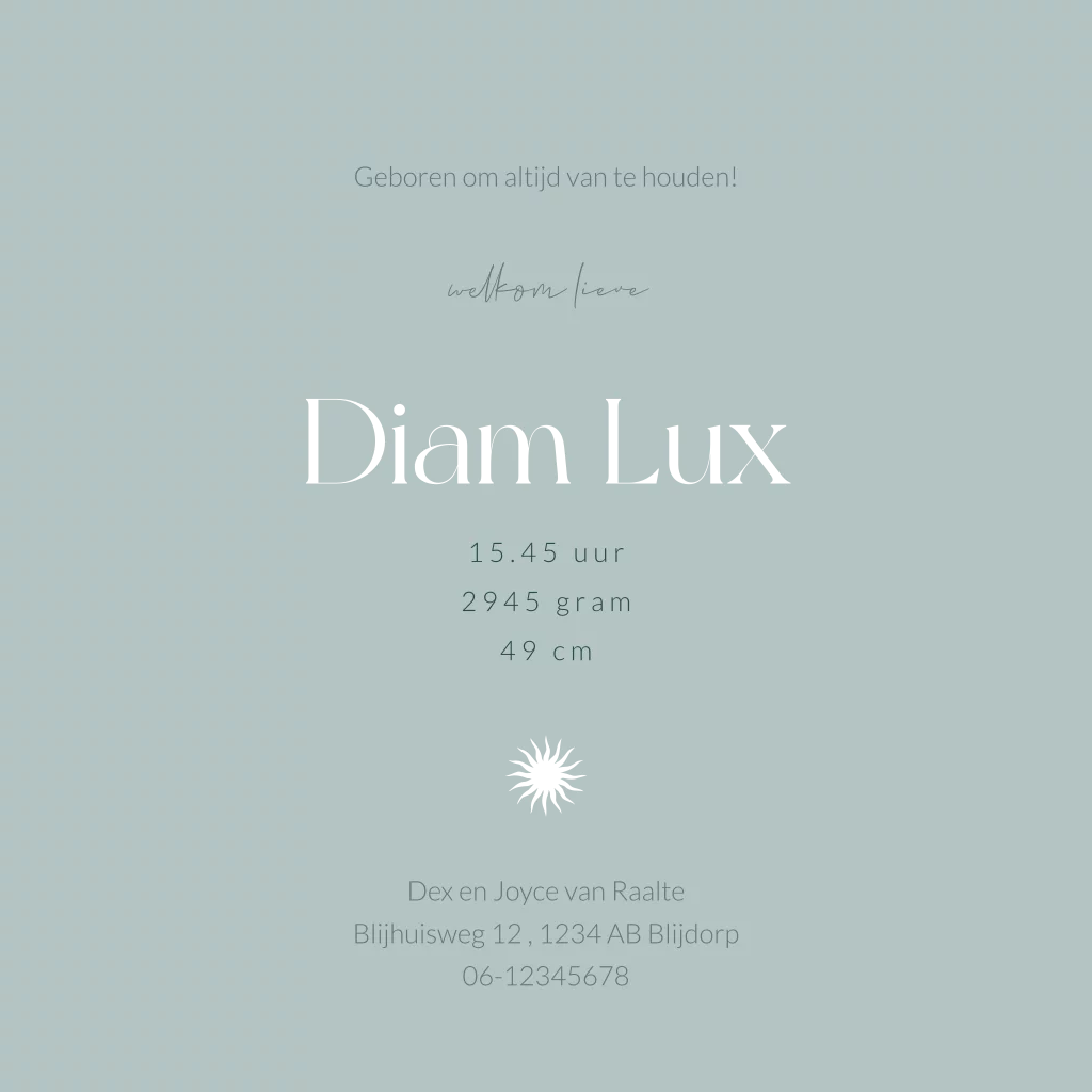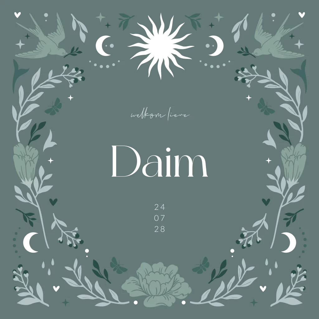 Dit prachtige geboortekaartje Daim met foliedruk en een boho kader is perfect voor ouders die op zoek zijn naar iets speciaals. Je ziet een boho ontwerp van de zon, maan, bloemen en vogels. De luxe foliedruk in goud maakt het kaartje echt een eyecatcher. Bij dit geboortekaartje voor een jongen hoort een bijpassende envelop in de kleur petrol, die het geheel compleet maakt. En om het nog specialer te maken, kunnen jullie de envelop sluiten met een prachtige ronde foliedruk sticker met boho zon.