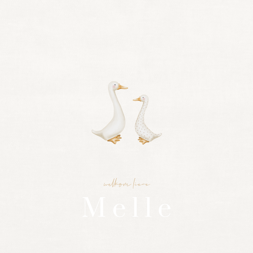 Rustige geboortekaartje met foliedruk en een lichte linnenlook achtergrond. Op dit nude geboortekaartje zie je een illustratie van een twee gansjes. Op dit kaartje Melle wordt gebruik gemaakt van goudfolie, dat geeft dit babykaartje een luxe uitstraling. Ook mogelijk met koperfolie, zilverfolie of roséfolie. Dit is aan te passen in de editor.