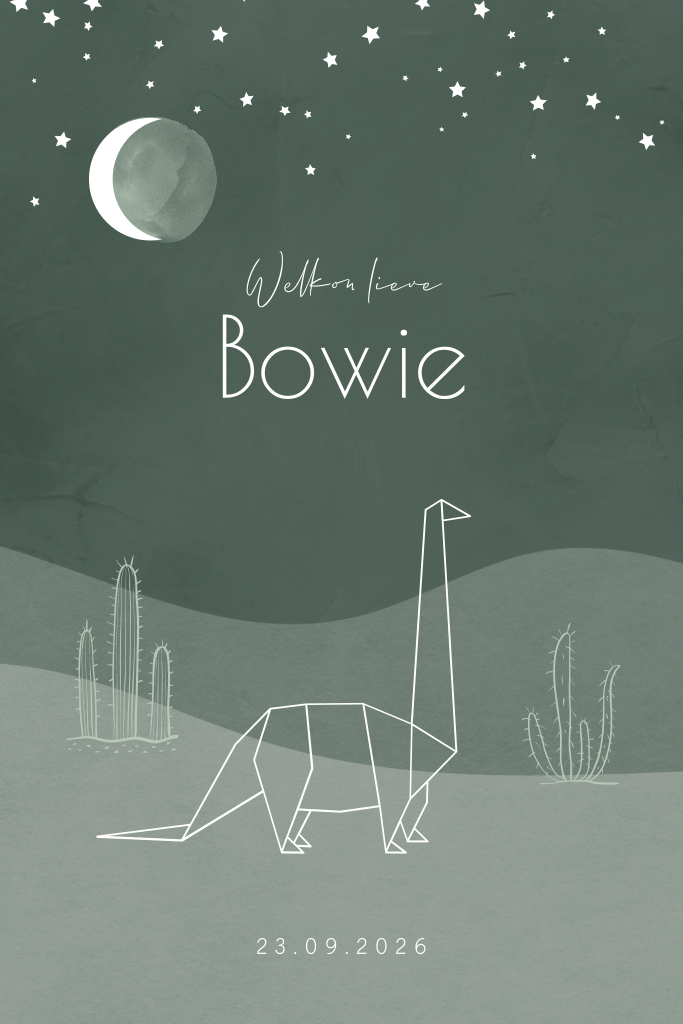 Tof, luxe geboortekaartje voor een jongen. Op dit jongenskaartje Bowie een geometrische dino in een glooiend landschap met cactussen. O.a. de maan en een aantal sterren worden gedrukt in goudfolie, wat een schitterende uitstraling geeft! Teksten en (folie)kleuren pas je eenvoudig aan in onze editor. Vragen? Laat het gerust weten!
