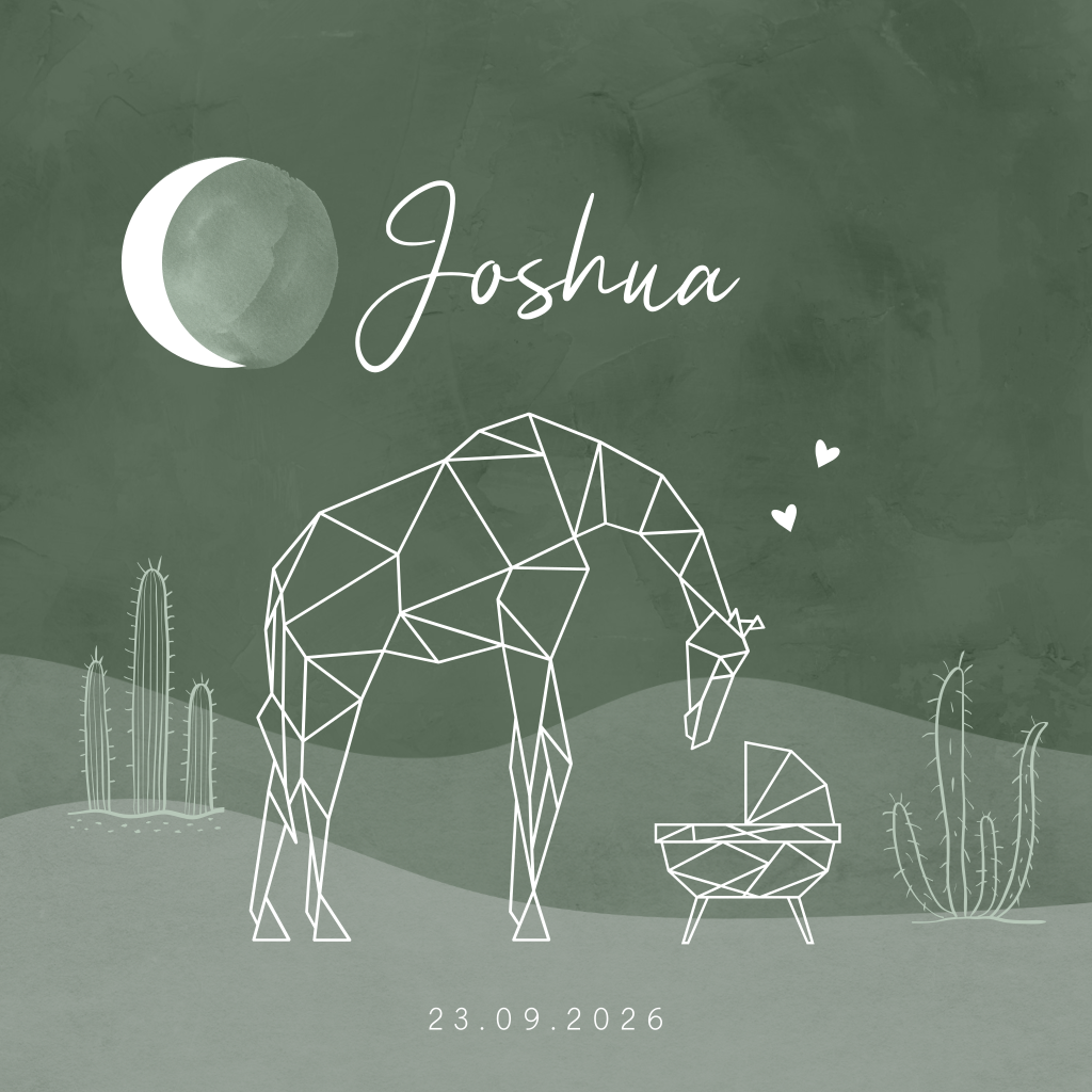 Op dit jongenskaartje zie je een geometrische giraffe, kijkend in het wiegje. Cactussen, een glooiend landschap, de maan en hartjes maken een prachtig geheel voor de trendy groene velvetlook achtergrond. Teksten, kleuren en lettertypes kun je eenvoudig aanpassen in de editor. Specifieke wensen of hulp nodig? Bel, mail of chat gerust, we helpen je graag!