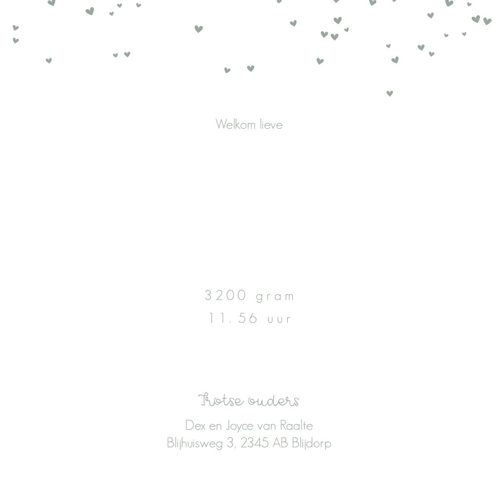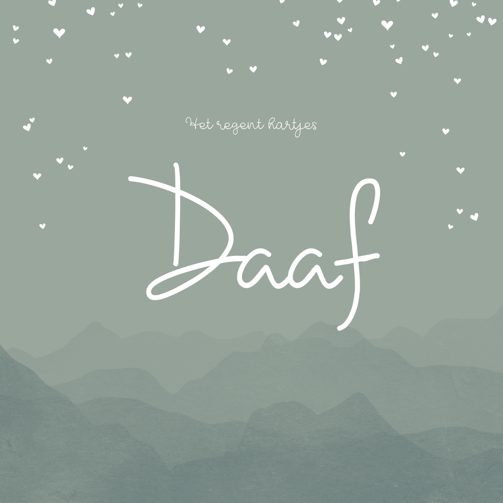 Hip geboortekaartje voor een zoon met de babynaam en kleine hartjes in écht goudfolie. Dit jongenskaartje met de naam Daaf, heeft trendy kleuren en watercolor bergen op de achtergrond. Foliedruk zorgt voor een luxe uitstraling en maakt dit kaartje extra speciaal. In onze editor kun je de kleur van de folie makkelijk wijzigen naar koperfolie, zilverfolie, roséfolie of zwartfolie.