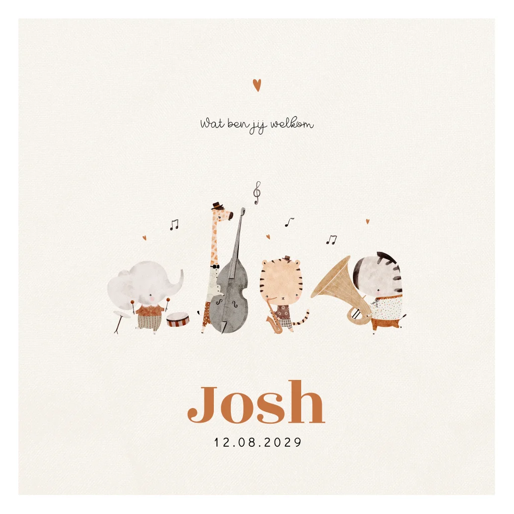 Lief geboortekaartje voor een jongen. Op dit jongenskaartje Josh een wit kader met beige linnenlook achtergrond en schattige jungle dieren die muziek maken met muziekinstrumenten, zoals een trommel en trompet. De muzieknootjes maken het helemaal af.