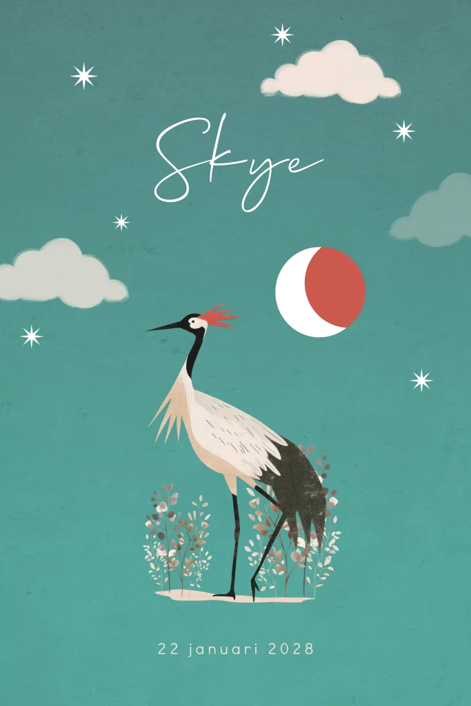 Luxe geboortekaartje jongen met kraanvogel, wolken, sterren en maan