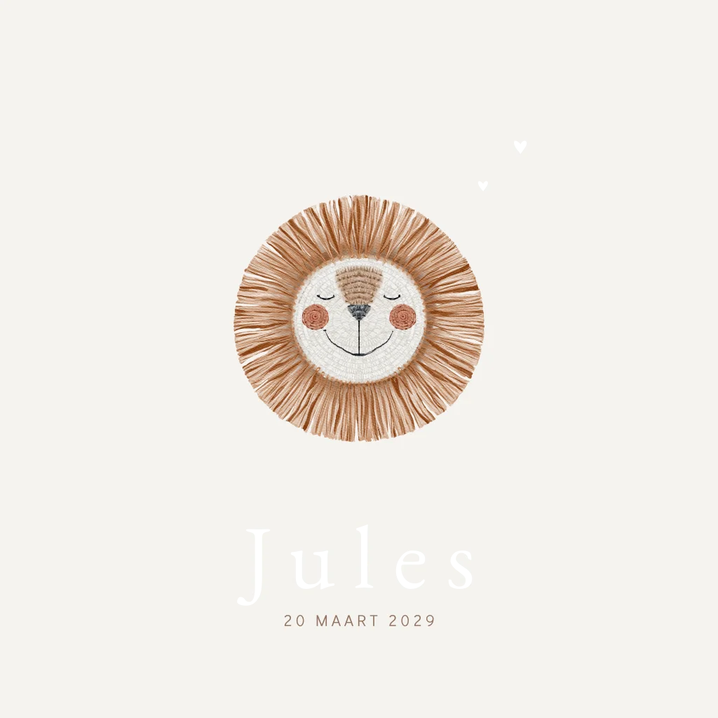 Rustig geboortekaartje voor een jongen met goudfolie. Op dit kaartje een juten rond kleedje van een leeuw met gouden hartjes. De gouden foliedruk geeft dit kaartje een extra luxe uitstraling. Ook mogelijk met koperfolie, zilverfolie of roséfolie. Dit nude geboortekaartje Jules kun je naar eigen smaak aanpassen in de editor. Hulp nodig? We helpen graag!