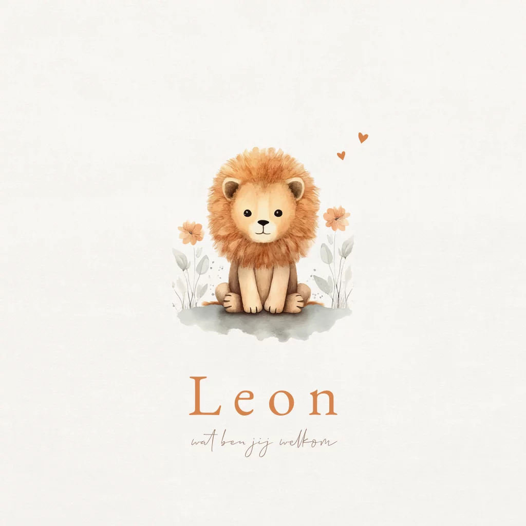 Lief jongens geboortekaartje met een mooie lichte linnenlook achtergrond. Op dit nude geboortekaartje zie je een illustratie van lief klein leeuwtje, een welpje, tussen de bloemen en hartjes.