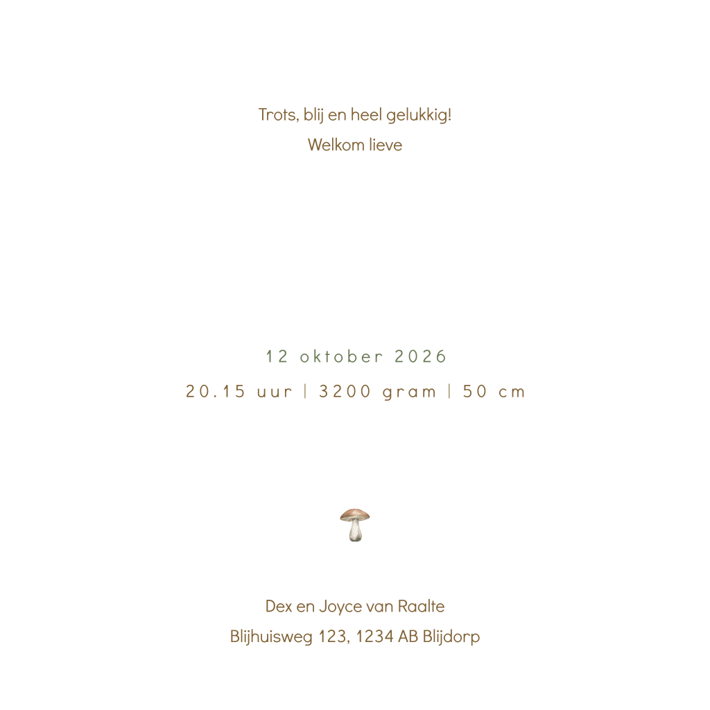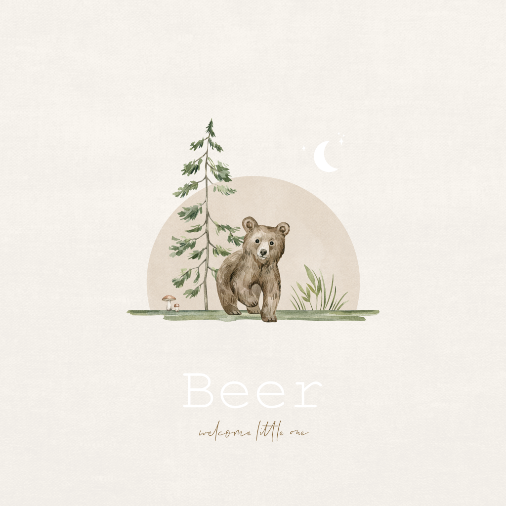 Prachtig illustratief babykaartje voor een zoon met rustige kleuren en foliedruk. Op dit naturel jongenskaartje Beer staat een lieve kleine beer in het bos. De nude kleuren geven een warme uitstraling. De namen en de maan worden gedrukt in echt goudfolie. De kleur van de folie is te wijzigen in bijvoorbeeld koperfolie of roséfolie. Vragen of wensen? Laat het gerust weten, wij helpen je graag.