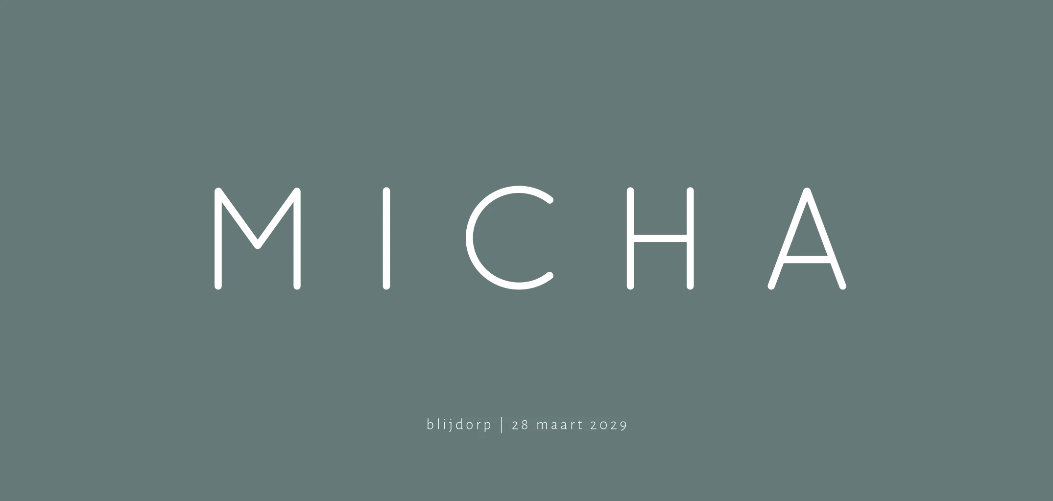 Een strak en basic geboortekaartje voor een jongen. Door het gebruik van foliedruk is het wel een heel exclusief kaartje. Op de achtergrond een mooie trendy kleur, die overloopt van licht naar donker. De babynaam Micha is ook mogelijk met zilverfolie, koperfolie, roséfolie of zwartfolie. Ook kun je van dit kaartje in enkele klikken een meisjeskaartje maken. Hulp nodig? Laat het ons gerust weten.