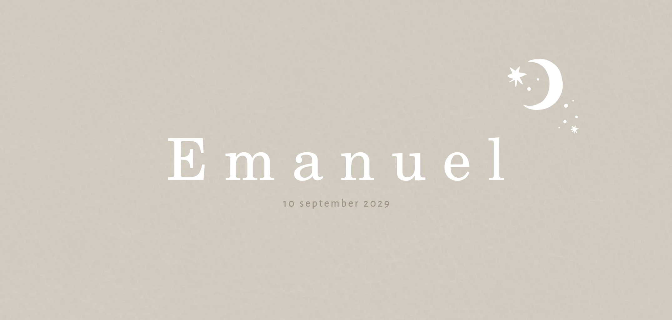 Blinkend basic geboortekaartje voor een jongen. Op dit babykaartje Emanuel een maan en sterren voor een stoere lederlook achtergrond. Deze strakke kaart heeft afgeronde hoeken en is voorzien van goudfolie. Teksten, (folie)kleuren en lettertypes pas je eenvoudig aan in onze ontwerpmodule. Hulp nodig? Ons ontwerpteam staat voor je klaar!