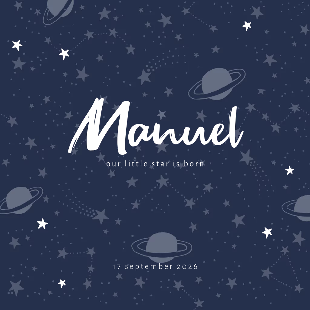 Ruimtelijk geboortekaartje voor een jongen. Dit babykaartje Manuel is voorzien van goudfolie wat de kaart een schitterende uitstraling geeft! Want jullie "little star is born". Op deze kaart met afgeronde hoeken, planeten en sterren in het donkerblauwe heelal. (Folie)kleuren, lettertypes en teksten pas je eenvoudig aan in onze editor. Hulp nodig? Laat het gerust weten!