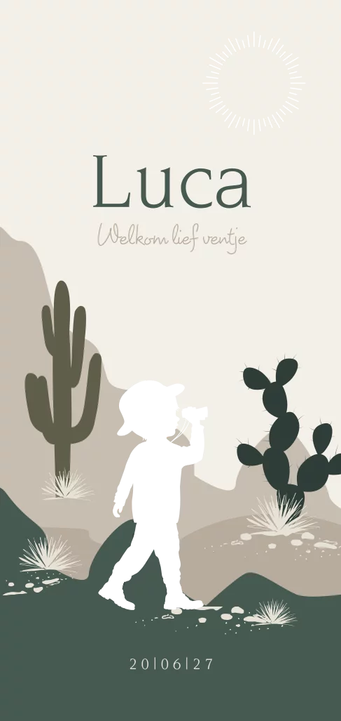 Een silhouet geboortekaartje voor een baby zoon! Op dit babykaartje Luca een silhouet met safari hoed en verrekijker in de uitgestrekte woestijn met rotsen en cactussen. Wat dit kaartje extra speciaal maakt, is dat het silhouetje van het jongetje en het stralende zonnetje worden gedrukt in écht goudfolie. Goudolie heeft een mooie glans en geeft het kaartje een extra luxe uitstraling. Pas dit kaartje met ronde hoeken naar je eigen smaak aan in de editor. Mogelijk in de volgende foliekleuren: holografisch folie, roséfolie of zilverfolie.
