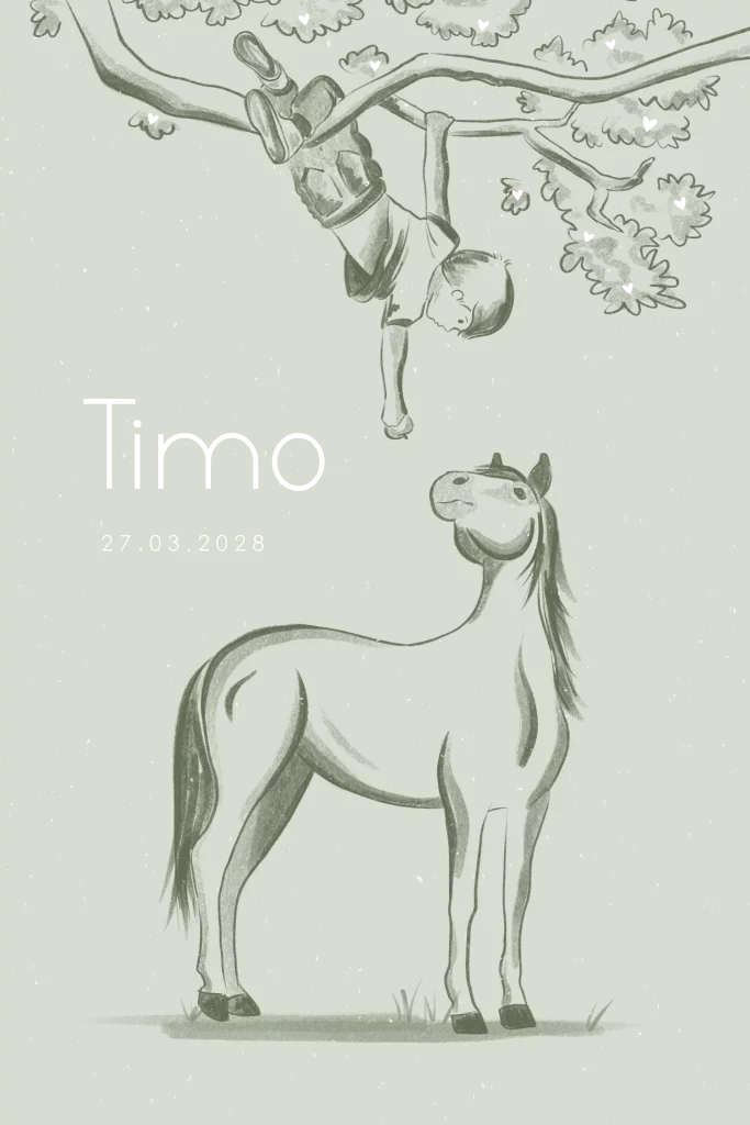 Geboortekaartje voor een jongen met een prachtige schets van een jongen, hangend in een boom, die een appel aan een paard geeft. Perfect voor ouders die gek zijn van paarden! De goudfolie geeft een luxe touch aan dit overwegend rustige geboortekaartje Timo. Pas deze kaart naar je eigen smaak aan in onze ontwerpmodule.