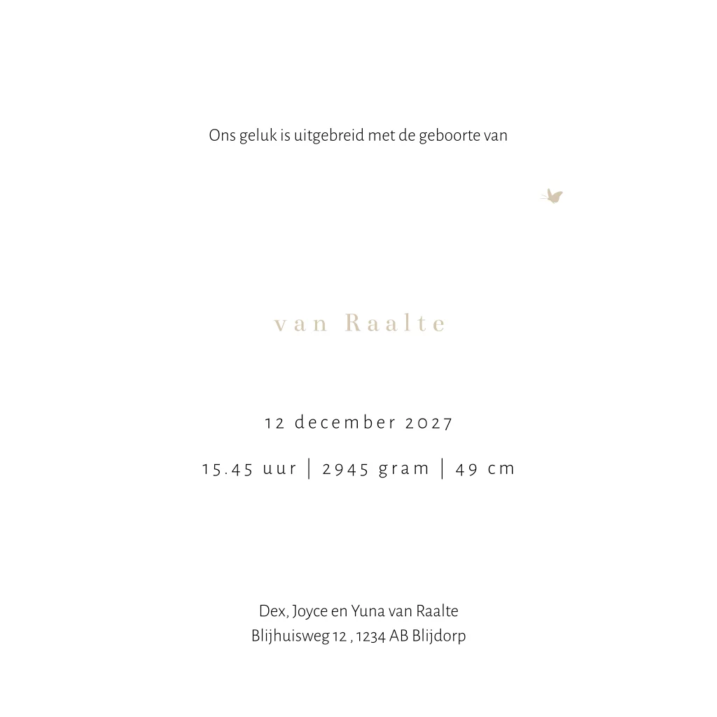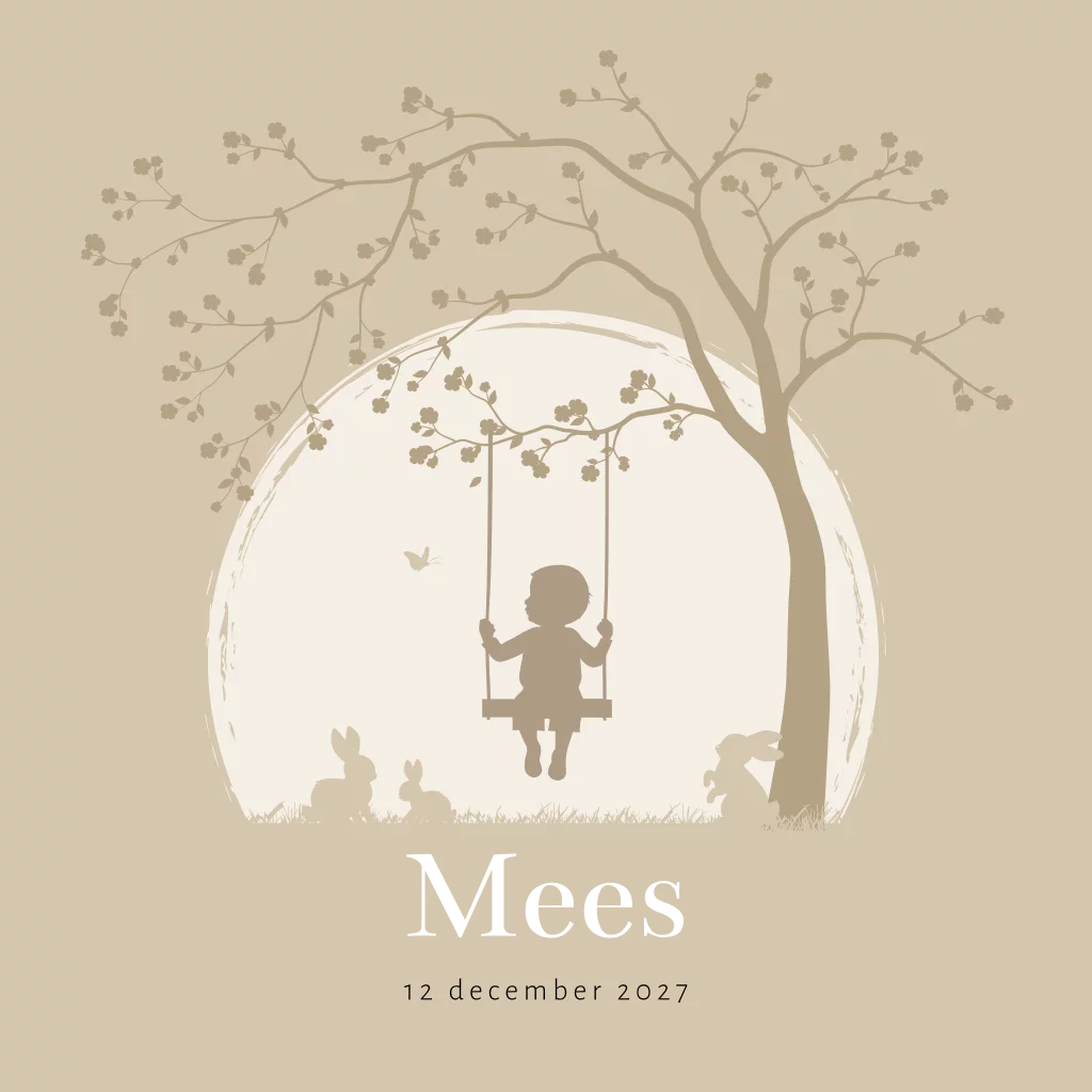 Silhouet geboortekaartje voor een eerste kindje, een zoon. Op dit jongenskaartje Mees zie je een silhouet van een jongen op een schommel aan een grote boom. Op de achtergrond konijnen en een hartje. Dit kaartje heeft mooie nude / naturel tinten. De naam van jullie zoon wordt gedrukt in echt goudfolie. De foliedruk geeft een unieke uitstraling aan dit silhouet geboortekaartje. Dit kaartje kun je ook gebruiken voor een andere gezinssamenstelling.