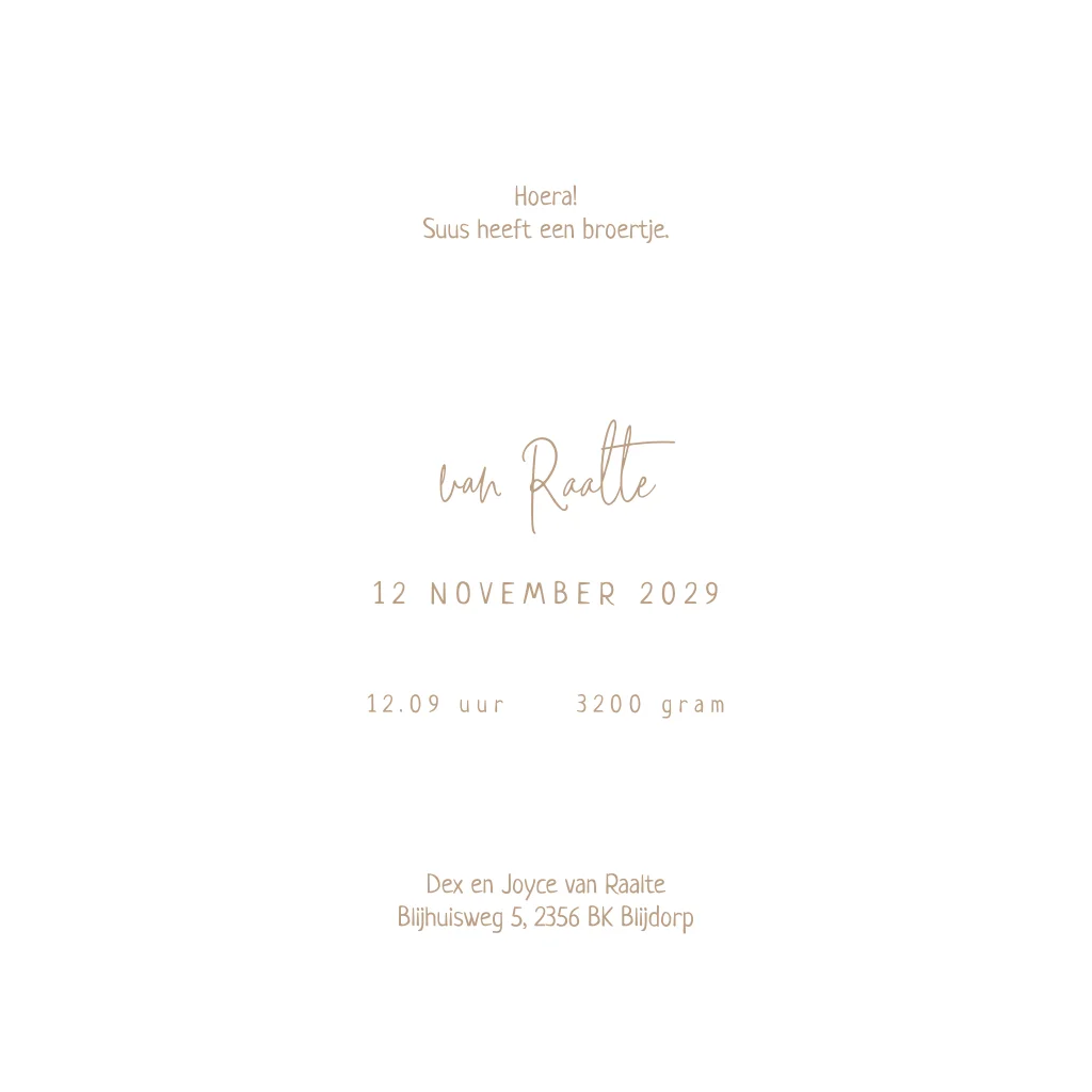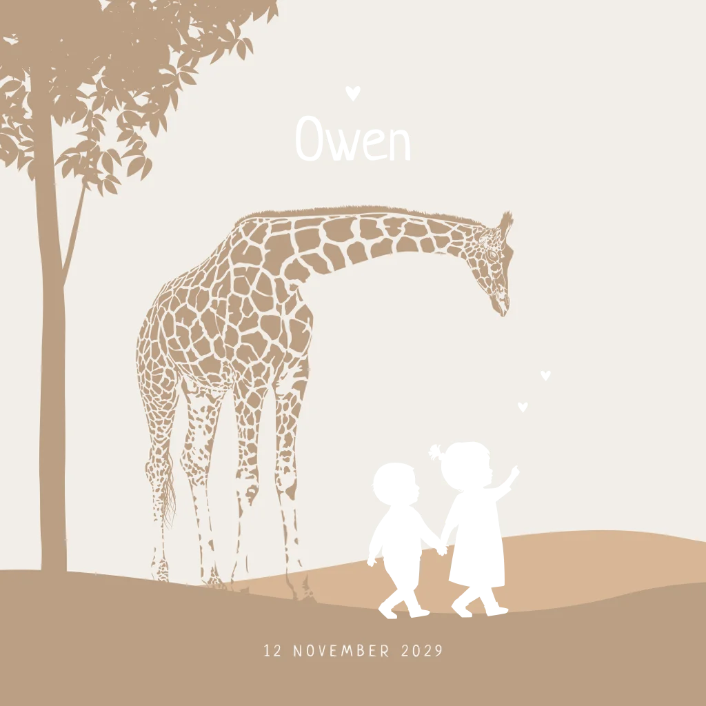 Dieren jungle geboortekaartje voor een tweede kindje, een broertje! Op dit silhouet babykaartje Owen een giraffe die boven de twee kindjes staat. Grote zus en haar kleine broertje wandelen hand in hand door het landschap. Dit kaartje heeft zachte ton sur ton kleuren. Extra uniek aan dit kaartje is de gouden foliedruk. De silhouetjes van de kindjes, de naam en hartjes worden gedrukt in écht goudfolie wat dit babykaartje een luxe uitstraling geeft.