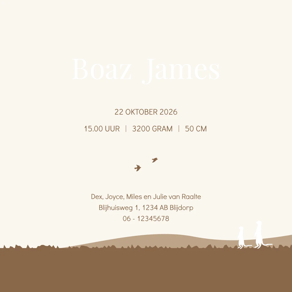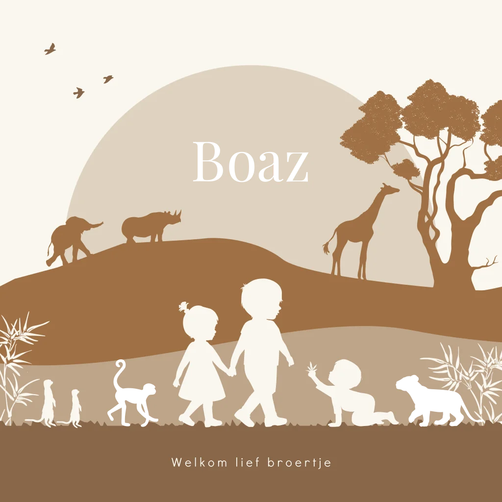 Hip silhouet geboortekaartje voor een derde kindje, een broertje! Op dit jongenskaartje Boaz zie je een grote broer en grote zus wandelen met hun kleine broertje tussen een bruin terracotta ton sur ton jungle landschap. Drie kindjes samen op avontuur in de jungle. Op dit babykaartje staan verschillende safari dieren waaronder een aapje, olifantje, giraffe en een leeuw welpje. De naam van jullie zoon, het aapje en het welpje worden gedrukt in echt goudfolie. Dit geeft het babykaartje een luxe uitstraling. Teksten, kleuren en silhouetten kun je eenvoudig aanpassen in de editor. Dit silhouet geboortekaartje is ook mogelijk voor een andere gezinssamenstelling.