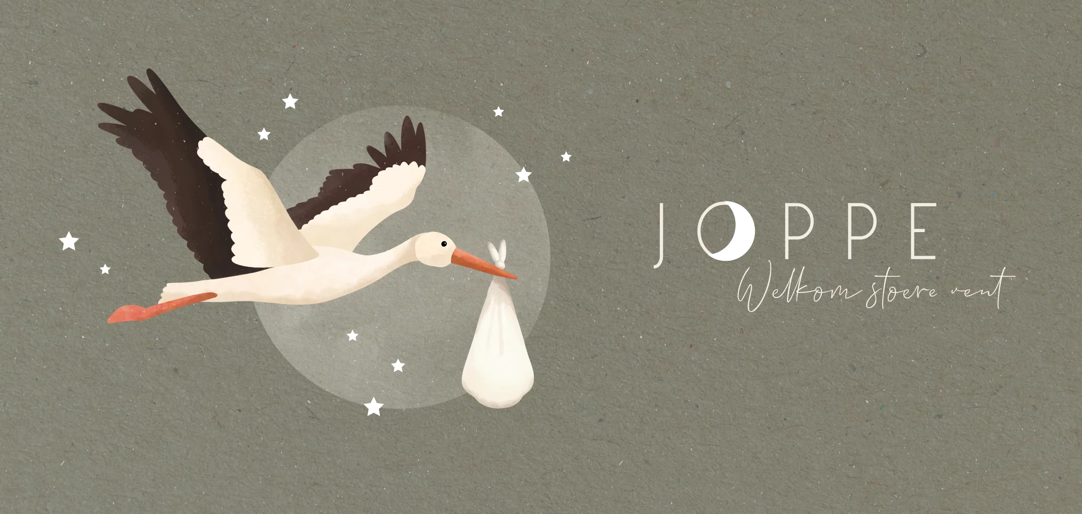 Prachtig geboortekaartje voor een jongen. De ooievaar vliegt met het kindje tussen de sterren door. Dit kaartje Joppe is echt een eyecatcher en zal iedereen verrassen. De sterren en maan worden gedrukt in glanzend goudfolie, dit maakt het kaartje extra bijzonder. Liever andere foliedruk? Dit pas je, samen met de tekst, gemakkelijk aan in de editor. Bel, mail of chat ons gerust voor vragen of hulp.