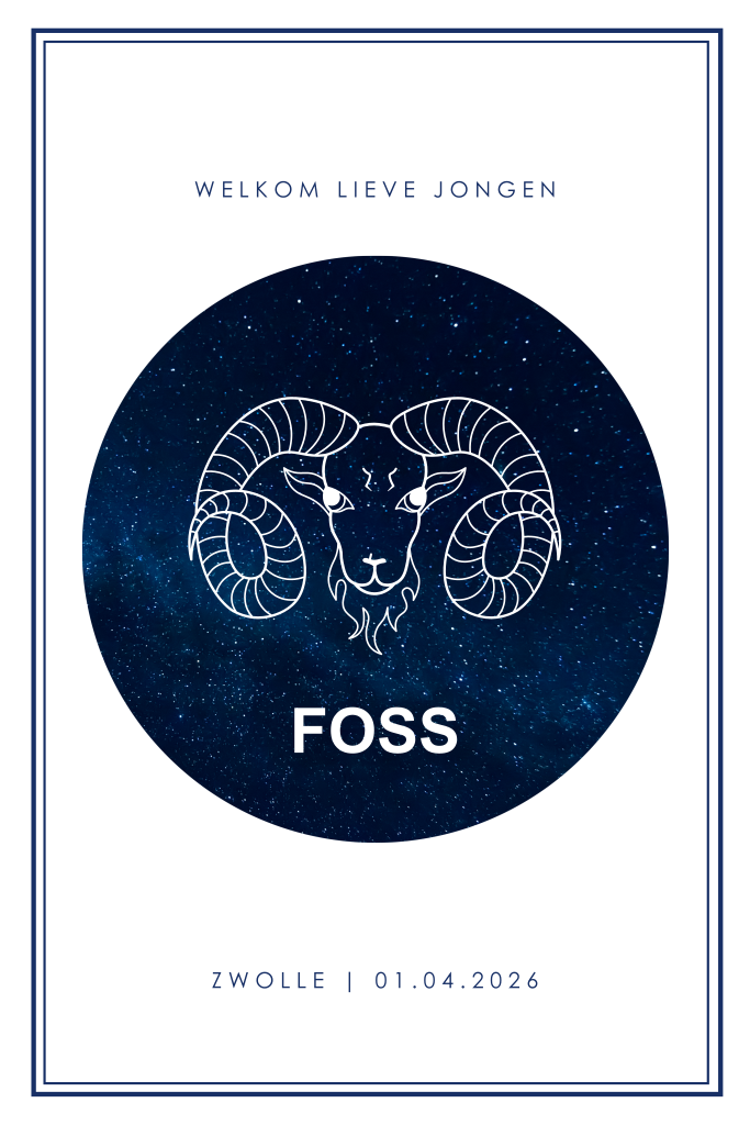 Luxe jongenskaartje met sterrenbeeld en echt foliedruk. Dit stoere geboortekaartje is helemaal de trend van nu! Op dit babykaartje een witte achtergrond met daarvoor een blauw heelal met een afbeelding van het dierenriemteken Ram in echt goudfolie. Alle gouden elementen op dit kaartje Foss worden gedrukt in echt goudfolie. Liever koperfolie, zilverfolie of roséfolie? Dit is aan te passen in de editor.