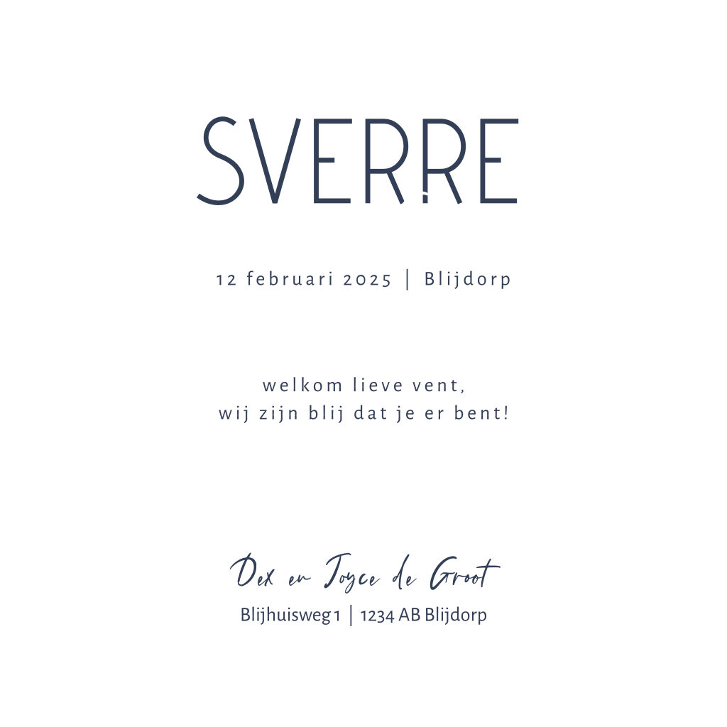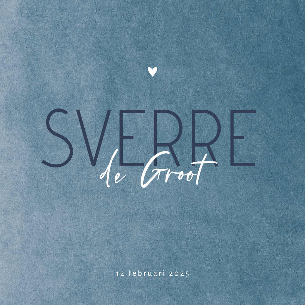 Een stoer geboortekaartje voor een jongen met ècht goudfolie. De achternaam staat gedrukt in goudfolie, met daarbij een hartje in folie. De babynaam Sverre en de achternaam komen als geheel mooi naar voren met de velvetlook achtergrond. Pas deze kaart naar eigen smaak aan in de editor, ook mogelijk met zilverfolie, koperfolie, roséfolie of zwartfolie. Hulp nodig bij het ontwerpen? Laat het ons gerust weten.