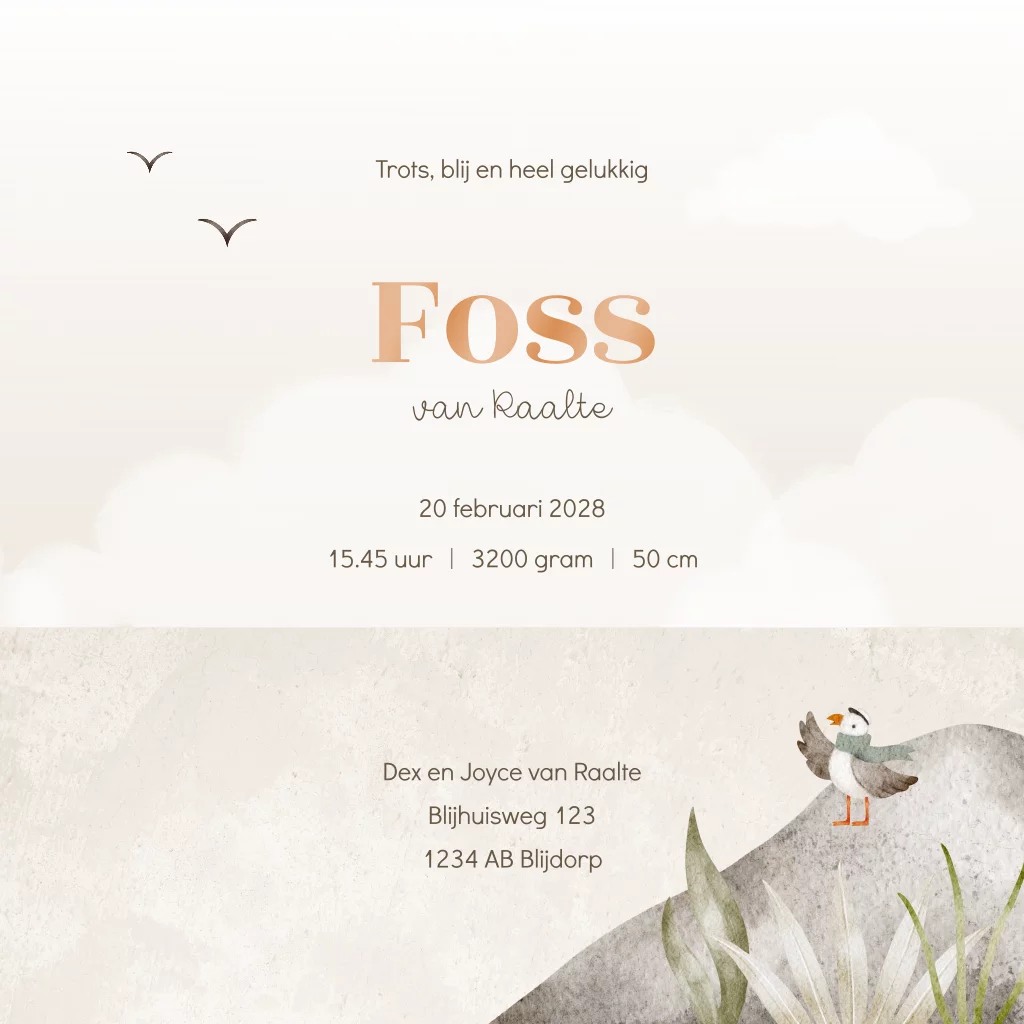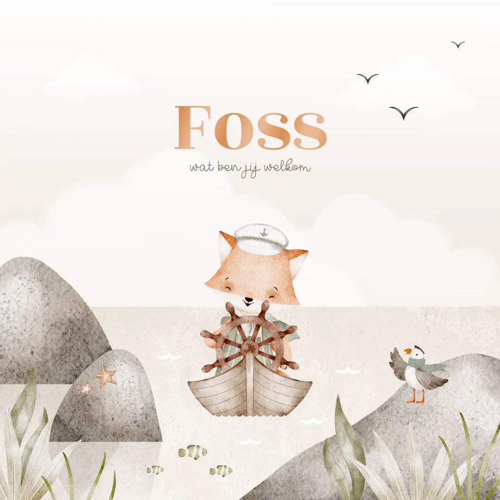 Rijk geïllustreerd geboortekaartje voor een jongen. De illustratie is lief en stoer tegelijk. Je ziet een schattig vosje op een boot tussen de rotsten op de zee. De hoogglans geeft het kaartje een luxe uitstraling en maakt het kaartje uniek. Pas dit geboortekaartje Foss geheel naar eigen wens aan in de editor. Hulp nodig? We helpen je graag.