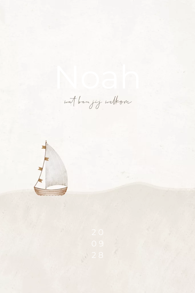 Een rustig geboortekaartje voor een jongen. Dit geboortekaartje Noah heeft neutrale beige kleuren met een illustratie van een boot varend op de zee. De goudfolie en ronde hoeken geven een luxe touch aan dit rustige geboortekaartje. Pas de kleuren, lettertypes en teksten eenvoudig aan in de editor.