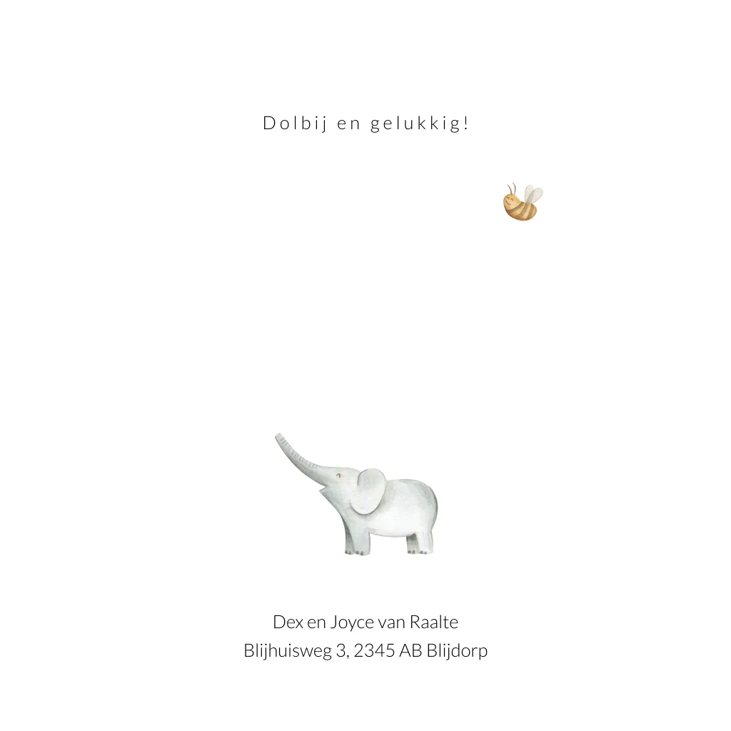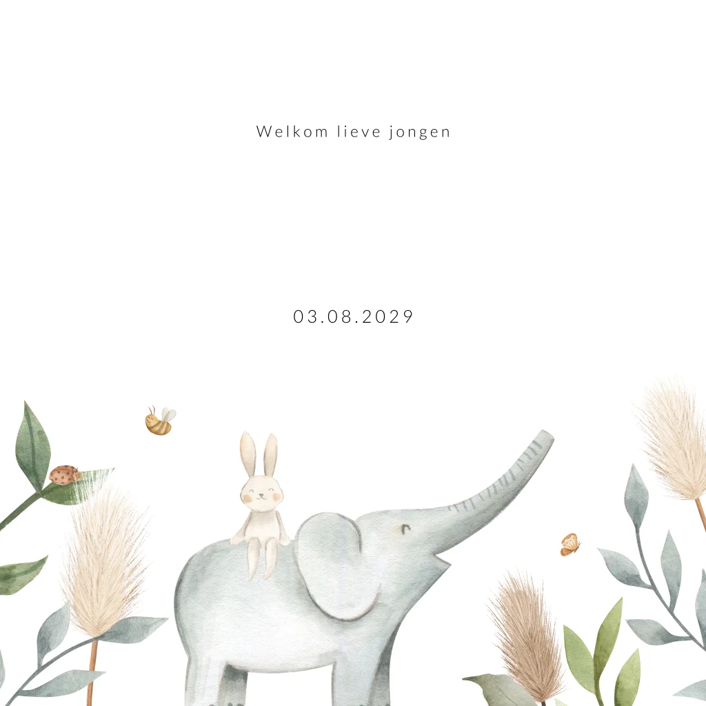Luxe dieren kaartje met foliedruk. Op dit geboortekaartje voor een jongen staan een lief olifantje, konijntje en verschillende droogbloemen in zachte aquarel kleuren. De babynaam en de kleine hartjes worden gedrukt in écht goudfolie, dat geeft je kaartje een extra luxe uitstraling. Verder op dit kaartje Brent een vlindertje, bijtje en een lieveheersbeestje. Teksten en kleuren zijn aan te passen in de editor. Ook mogelijk met koperfolie, roséfolie, zwartfolie of zilverfolie.