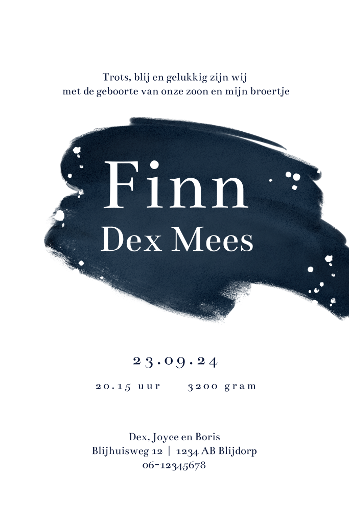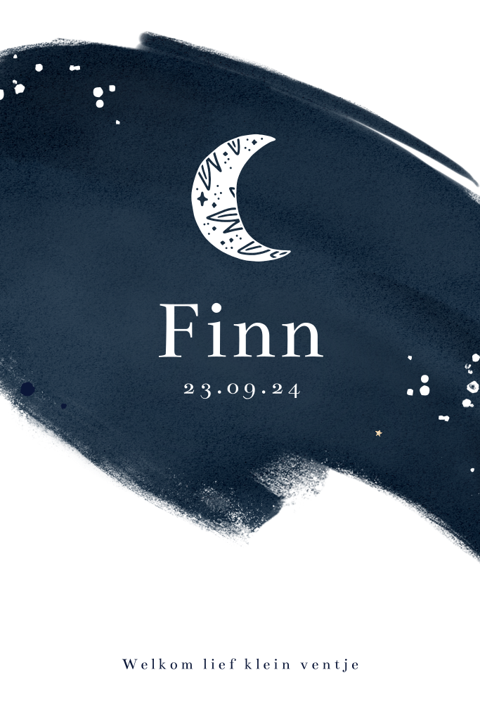Hip geboortekaartje voor een jongen met onder andere de babynaam en de maan in écht goudfolie. De goudfolie heeft een mooie glans en springt er helemaal uit in combinatie met wit en de donkerblauwe aquarel veeg op de achtergrond. De spetters en kleine hartjes maken dit kaartje Finn compleet. In onze editor kun je de kleur van de folie makkelijk wijzigen naar koperfolie, zilverfolie, roséfolie of zwartfolie.