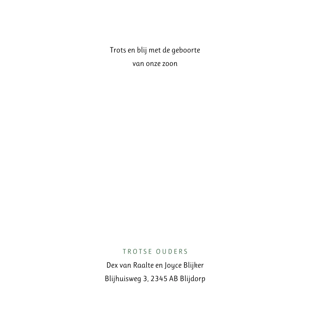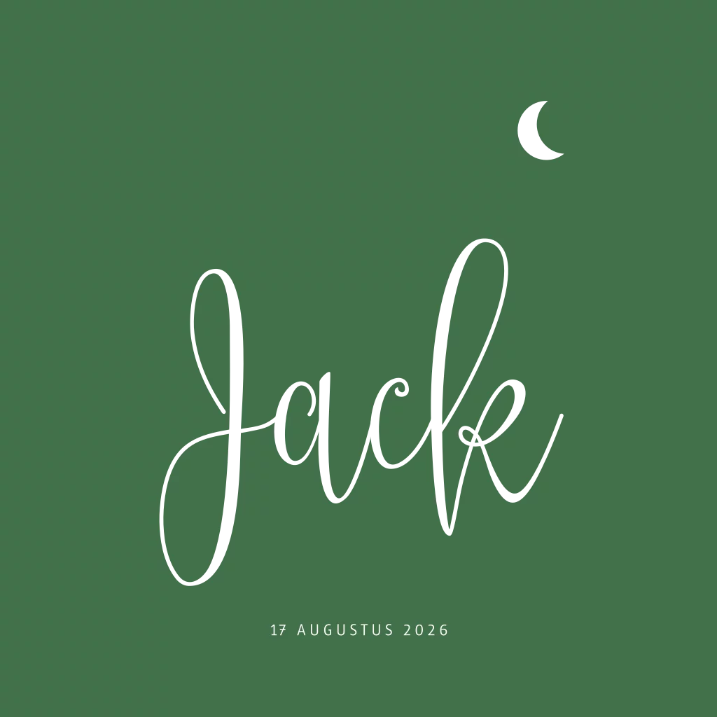 Hip geboortekaartje voor een zoon. Dit jongenskaartje Jack heeft een achtergrond in een mooie trendy groene kleur. De babynaam, in een mooi sierlijk lettertype en het kleine maantje, worden gedrukt in écht goudfolie, wat je kaartje een extra luxe uitstraling geeft. De teksten en lettertypes, evenals de kleur van de folie, kun je zelf bewerken in de editor. Ook kun je de kleur van de leren achtergrond naar je eigen smaak aanpassen.