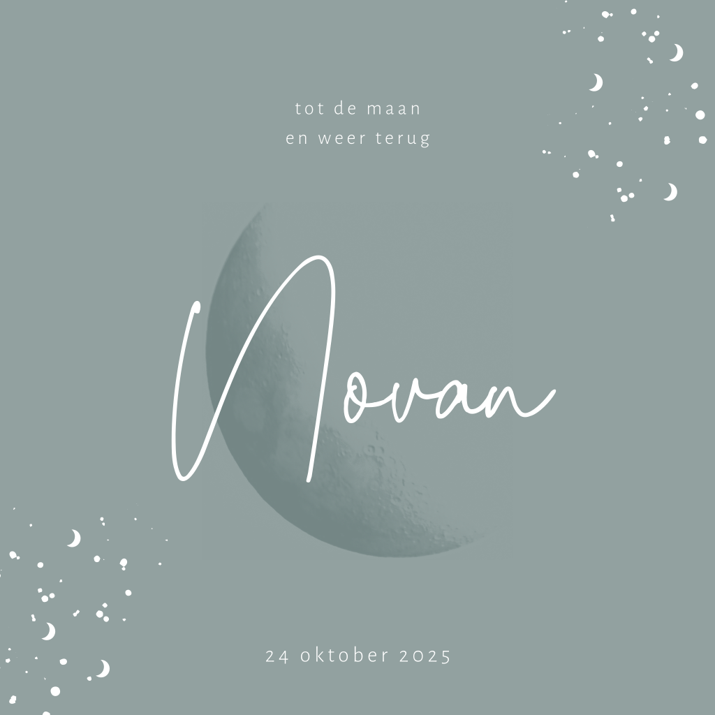 Basic geboortekaartje voor een zoon met de babynaam en kleine maantjes in écht goudfolie. Dit jongenskaartje met de naam Novan, heeft een zachte blauwe achtergrond en krijgt door de folie een extra luxe uitstraling. Pas dit kaartje naar je eigen smaak aan in de editor. De kleur van de folie kun je wijzigen naar koperfolie, zilverfolie, roséfolie of zwartfolie.