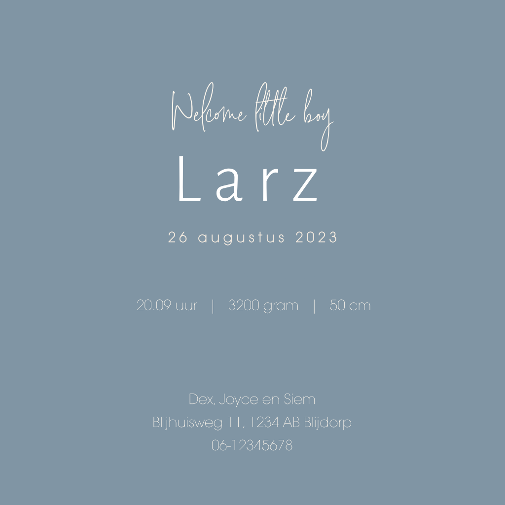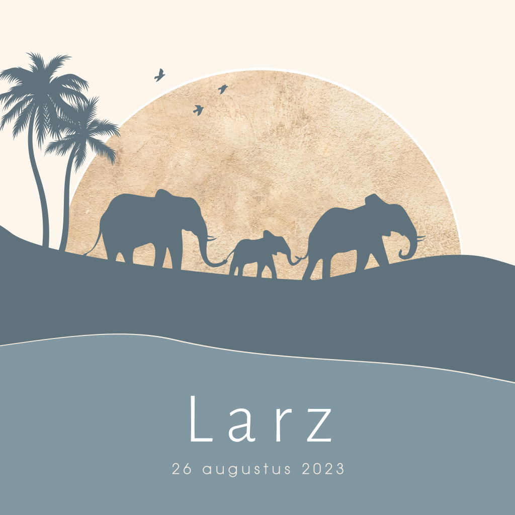 Hip silhouet geboortekaartje in jungle thema. Op dit jongenskaartje Larz staan 2 grote olifanten met een klein baby olifantje er tussen. De babynaam wordt gedrukt in écht goudfolie, wat je kaartje een gave, luxe uitstraling geeft. Palmbomen en een ondergaande zon maken de safari sfeer compleet. Liever andere kleuren of lettertypes? Pas het eenvoudig aan in onze editor.