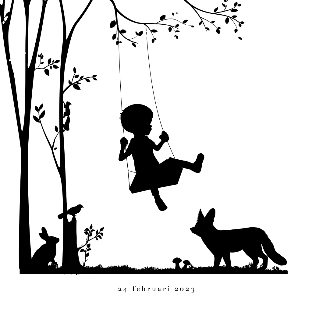 Hip herfst geboortekaartje van een klein jongetje op de schommel in het bos. De gouden elementen op dit silhouet kaartje Lenn worden gedrukt in écht goudfolie. Foliedruk geeft je kaart een extra luxe uitstraling. Verder op dit kaartje afbeeldingen van een boom, vos, eekhoorn, konijntje en paddenstoeltjes. Teksten en kleuren, evenals het silhouet zijn aan te passen in de editor. Ook mogelijk met zilverfolie, koperfolie of roséfolie.
