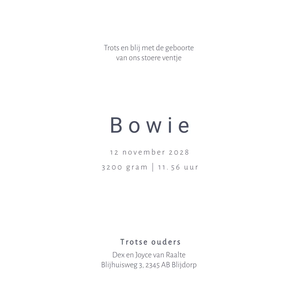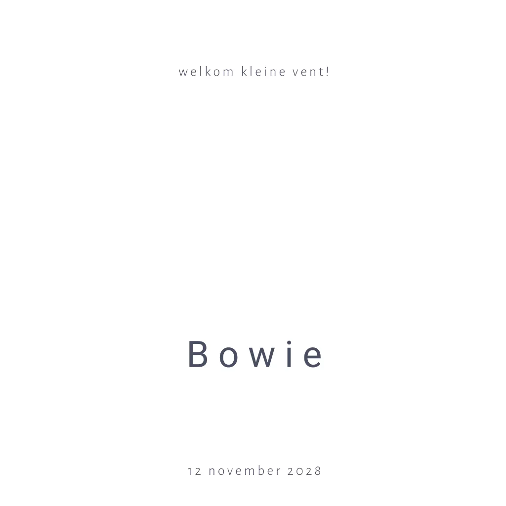 Dieren geboortekaartje voor een zoon. Op dit jongenskaartje Bowie staan one line illustraties van een lief klein olifantje, welpje en giraffe. De goudkleurige elementen op de voor- en binnenzijdes van dit kaartje, waaronder de lijntekeningen, worden gedrukt in écht goudfolie. Verder is deze babykaart overwegend wit en oogt daardoor rustig en clean. Maar door het gebruik van foliedruk een exclusief kaartje met een luxe uitstraling. Pas het kaartje naar je eigen smaak aan in de editor, ook mogelijk met zilverfolie en roséfolie