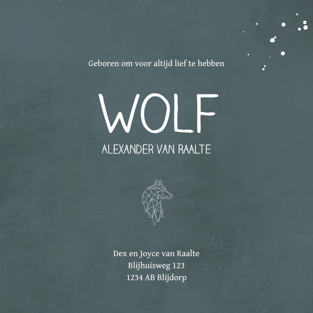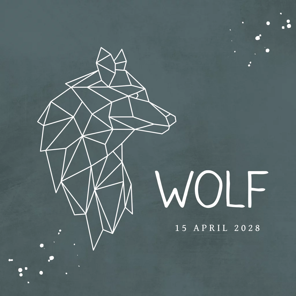 Super stoer toch? Een geboortekaartje voor een jongen met de naam Wolf, met een afbeelding van een geometrische wolf erop! Op dit kaartje worden de gouden elementen die je ziet op de kaart gedrukt met echt goudfolie. Dit geeft de kaart een luxe uitstraling. Een goede combinatie met de donkere achtergrondkleur. Ook mooi met zilverfolie of roséfolie. Dit is eenvoudig aan te passen in de editor, evenals de naam van jullie zoon en alle andere teksten.