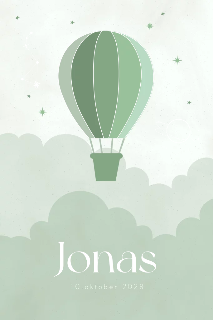 Dit geboortekaartje voor een jongen met luchtballon tussen de wolken en sterren en planeten is een prachtig ontworpen kaartje voor ouders die op zoek zijn naar een unieke en stijlvolle geboorteaankondiging. Met de toevoeging van prachtige gouden foliedrukdetails zal dit kaartje zeker de aandacht trekken van vrienden en familie. Maak het geheel af met een donkergroene envelop en bijpassende sluitzegel met luchtballon en sterren. Bestel vandaag nog dit geboortekaartje Jonas en maak van de geboorte van jullie kindje een onvergetelijke gebeurtenis!