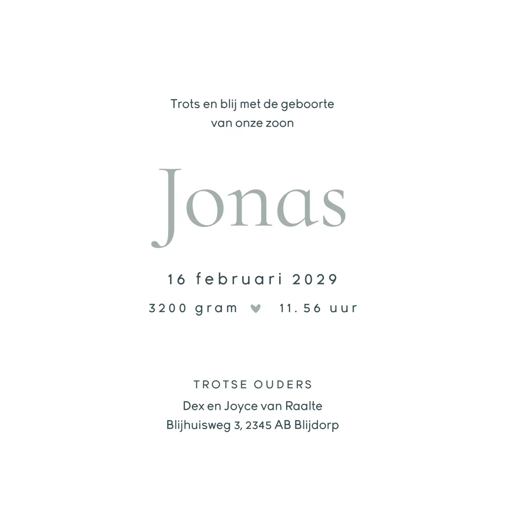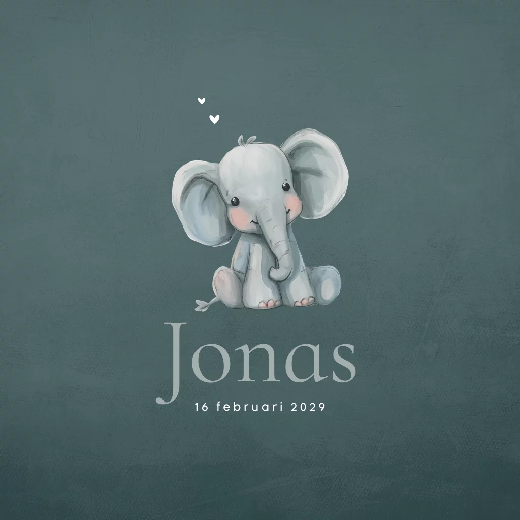 Basic geboortekaartje voor een zoon met de babynaam en een schattig baby olifantje. Dit jongenskaartje met de naam Jonas, heeft een trendy groene/blauwe achtergrond. Boven het olifantje staan 2 kleine hartjes.