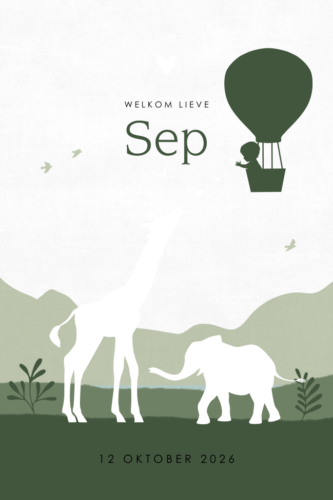 Silhouet geboortekaartje voor een eerste kindje, een zoon. Op dit babykaartje Sep een jongen in een luchtballon met een groen ton-sur-ton berglandschap en een silhouet van een giraffe en olifant. De hartjes geven dit tafereeltje een lieve uitstraling, de ronde hoeken en linnenlook achtergrond geven dit kaartje een speels effect. Alle gouden elementen op deze kaart worden gedrukt in echt goudfolie. De foliedruk geeft een luxe uitstraling aan dit babykaartje. Pas het kaartje naar je eigen smaak aan in de editor. Ook mogelijk voor een andere gezinssamenstelling of met andere foliedruk zoals koperfolie, roséfolie of zilverfolie.