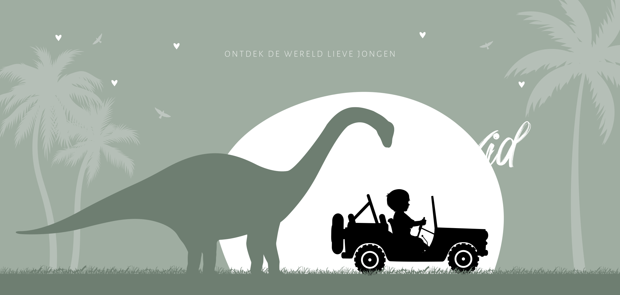 Geboortekaartje silhouet jongen in jeep met dinosaurus