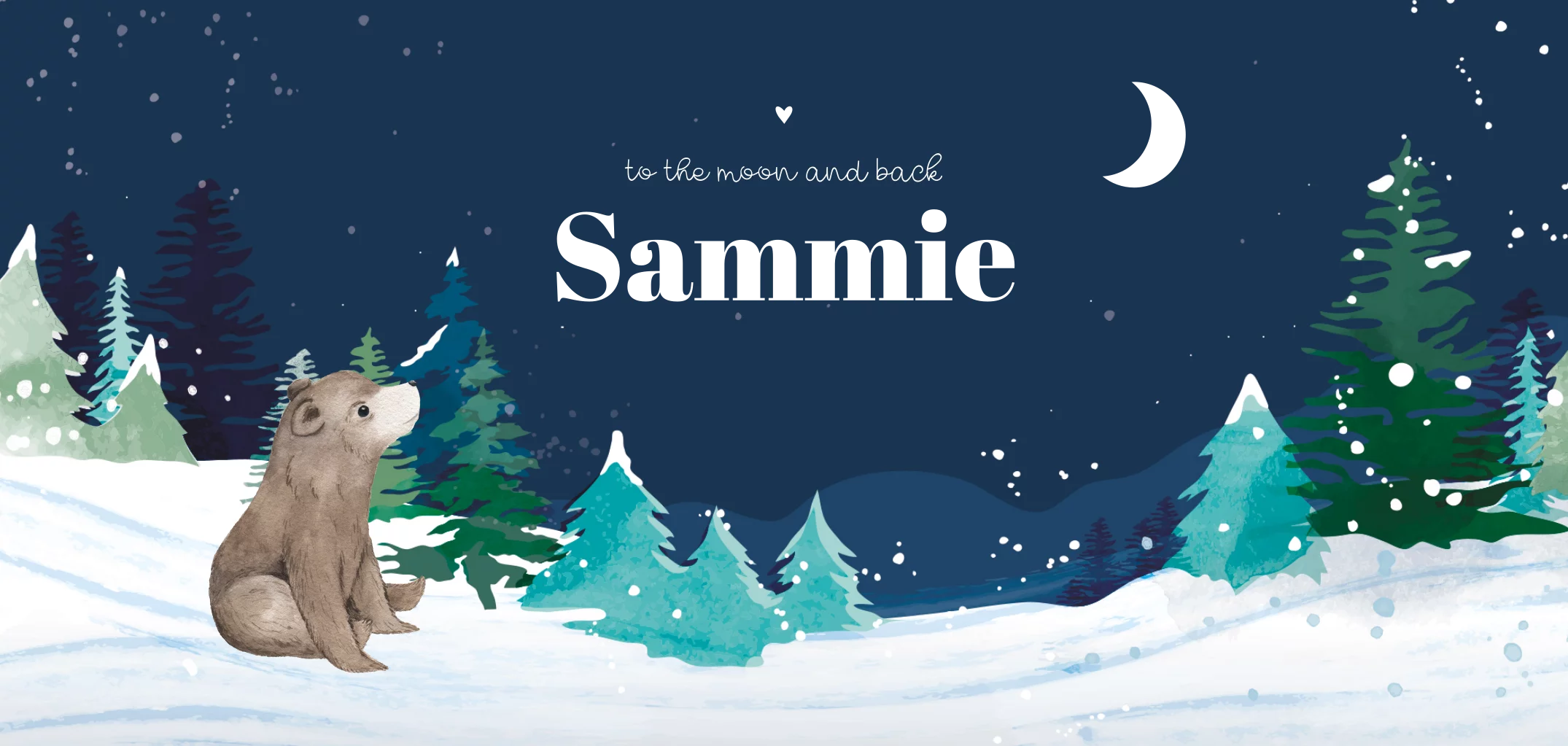 Een winter geboortekaartje voor een jongen. Dit geboortekaartje Sammie is rijk geïllustreerd met een sneeuw landschap, dennenbomen en lief beertje. De naam, het hartje en de maan worden gedrukt in écht goudfolie. Dat geeft een luxe en magische uitstraling aan dit bijzondere geboortekaartje. Perfect voor een kindje die in de winter geboren wordt! Pas dit babykaartje naar je eigen smaak aan in de editor.