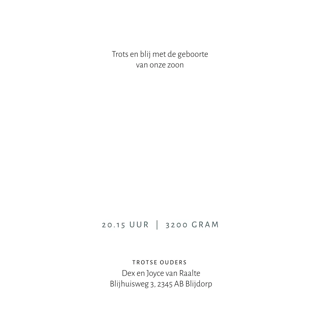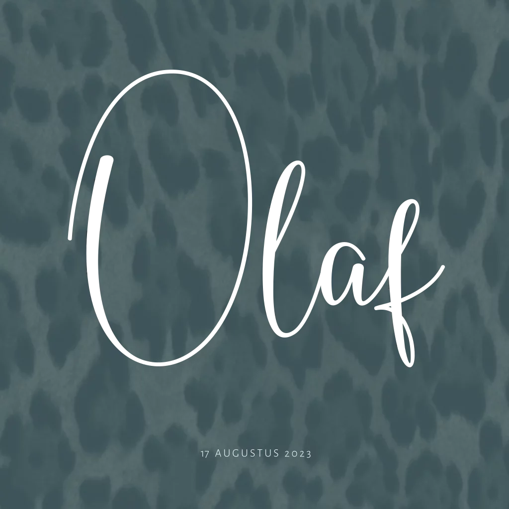Geboortekaartje voor een jongen met een basic design, maar exclusief door het gebruik van foliedruk. Dit luxe kaartje Olaf heeft op de achtergrond een dierenprint in een trendy kleur. De babynaam wordt gedrukt in écht goudfoliefolie. Pas deze kaart naar je eigen smaak aan in de editor, ook mogelijk met zilverfolie, koperfolie, roséfolie of zwartfolie.