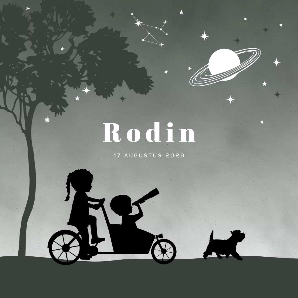Geef je zoon een uniek geboortekaartje met dit silhouet geboortekaartje met goudfolie. Op dit jongenskaartje Rodin zie je een silhouet van een jongentje in de bakfiets. Grote zus fietst met haar kleine broertje rond op zoek naar sterren. Het jongetje kijkt door een telescoop naar de fonkelende sterrenhemel. Het hondje wandelt voor de bakfiets met de kinderen uit. Op de achtergrond van dit kaartje zie je een mooie sterrenhemel met een planeet. Je kunt dit geboortekaartje naar eigen wens aanpassen in de online editor. Dit kaartje is ook mogelijk voor een andere gezinssamenstelling of met een ander silhouet.