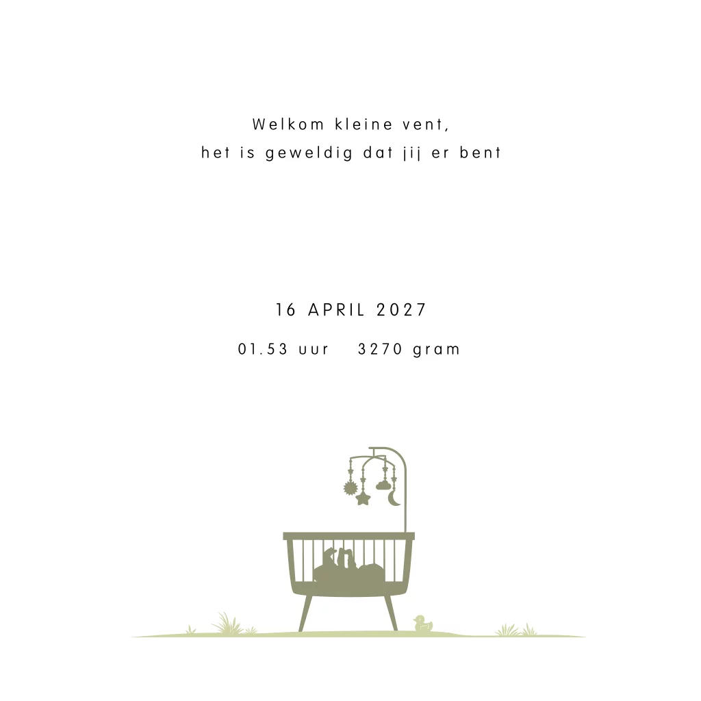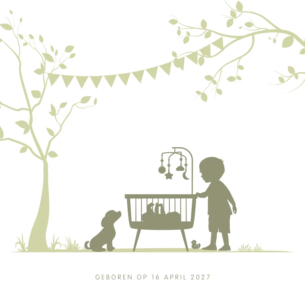 Silhouet geboortekaartje voor een tweede zoon met foliedruk. Op dit jongenskaartje Aaron staat een grote broer samen met een klein hondje kijkend in een wieg waarin een klein baby broertje ligt. De babynaam en de dwarrelende blaadjes worden gedrukt in écht goudfolie. De folie heeft een mooie glans en geeft je kaartje een extra luxe uitstraling. Teksten en kleuren, evenals de silhouetten zijn aan te passen in de editor. Ook mogelijk voor een andere gezinssamenstelling. De kleur van de folie kun je gemakkelijk wijzigen naar zilverfolie, roséfolie of holografisch folie.