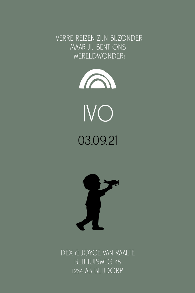 Exclusief silhouet geboortekaartje voor een jongen. De regenboog en de wereldbol op dit kaartje Ivo worden gedrukt in echt zilverfolie. De kleuren zijn gemakkelijk aan te passen in de editor. Ook kun je kiezen voor goudfolie, koperfolie of roséfolie.