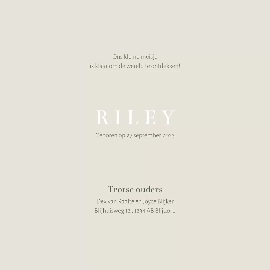 Dit geboortekaartje is een ontwerp van Jollein® uit de Botanical collectie en is speciaal in samenwerking met Jollein® ontworpen. Alle designelementen staan daarom vast waardoor het ontwerp zelf niet aanpasbaar is. Je kunt de teksten uiteraard wel gemakkelijk aanpassen in de editor.