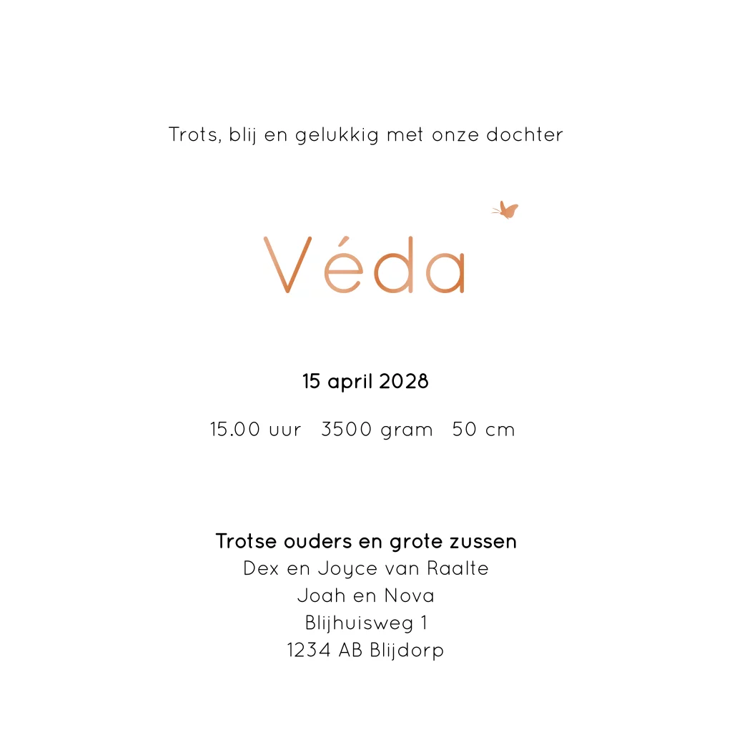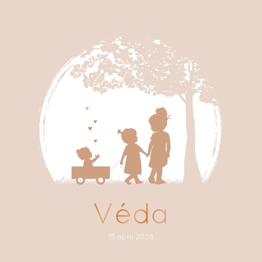 Silhouet geboortekaartje in trendy roze terracotta kleuren voor een derde kindje, een zusje. Op dit meisjeskaartje Véda zie je twee grote zussen met een bolderkar waarin hun baby zusje zit. De babynaam, geboortedatum en de kleine hartjes worden gedrukt in hoogglans. Teksten, kleuren en silhouetten kun je aanpassen in de editor. Dit geboortekaartje is ook mogelijk voor een andere gezinssamenstelling.